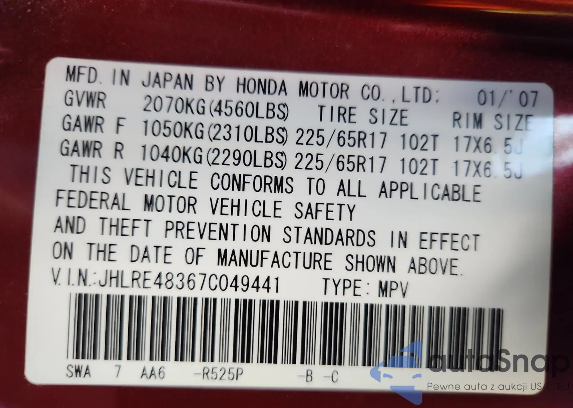 LOT: 85196455 VIN: JHLRE48367C049441