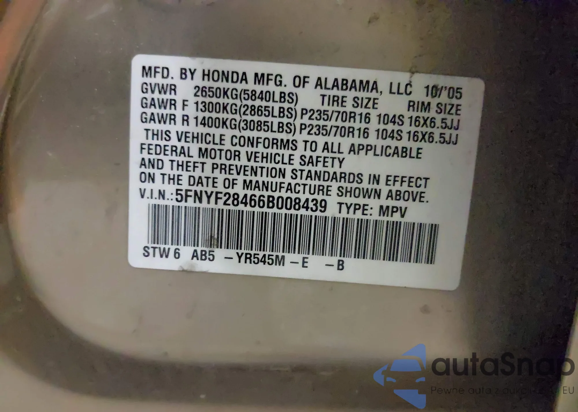LOT: 43479400 VIN: 5FNYF28466B008439