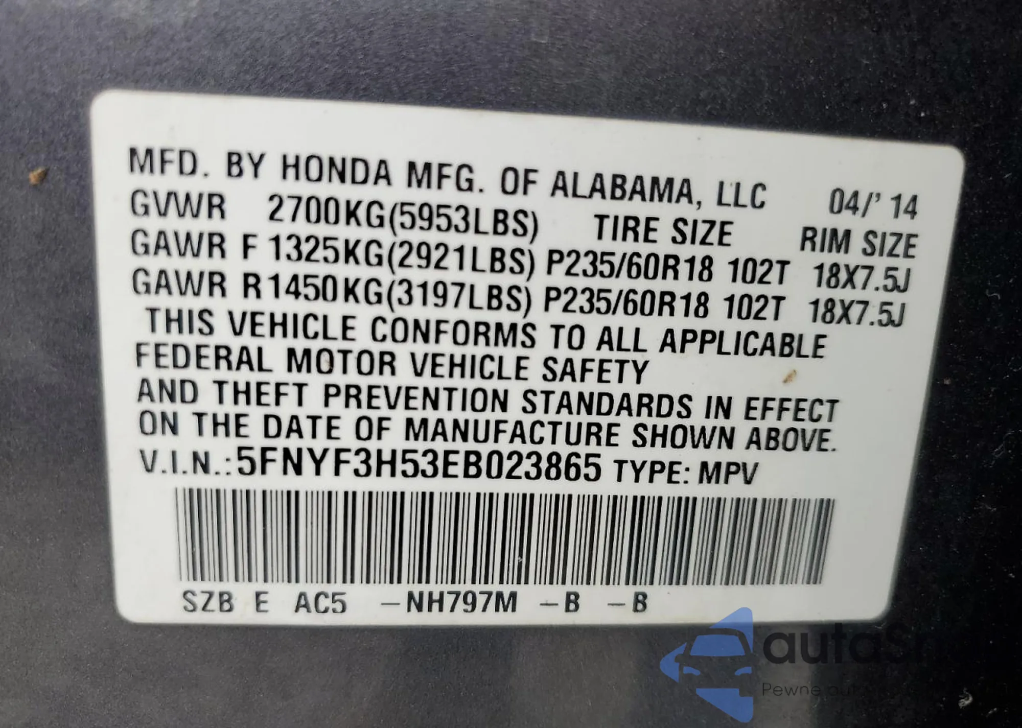• VIN 5FNYF3H53EB023865
