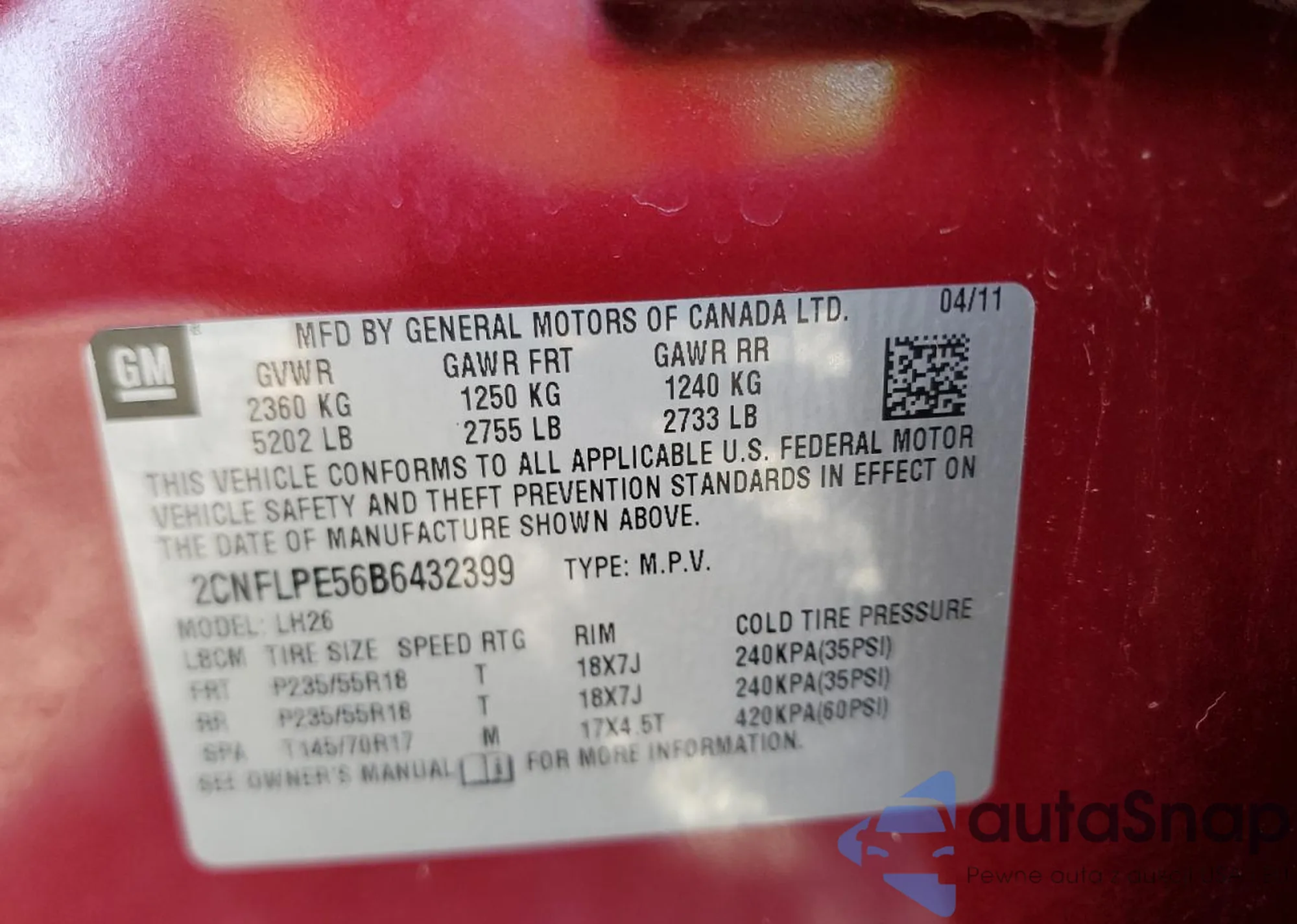 LOT: 81895815 VIN: 2G1WT57K091100213