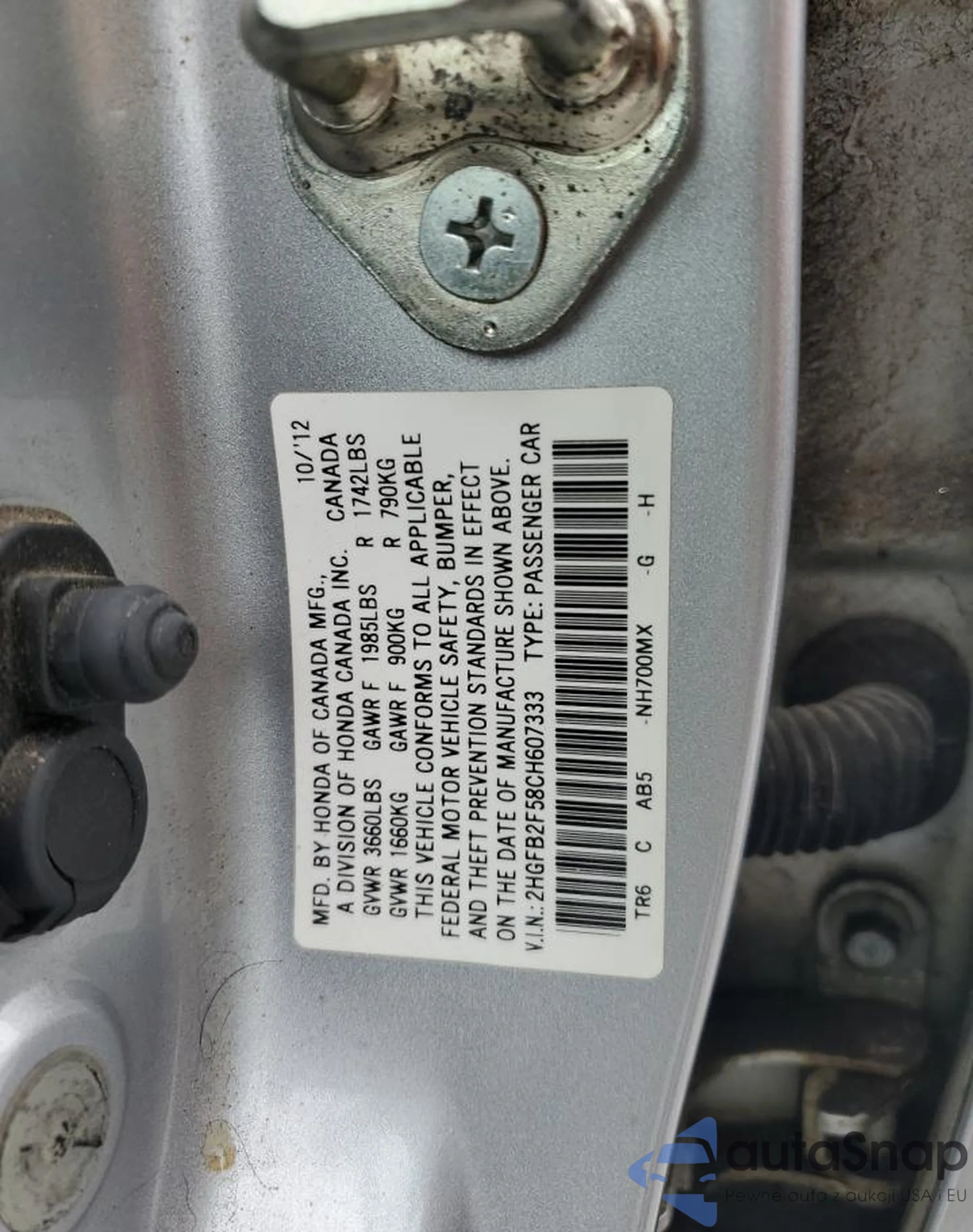 • VIN 2HGFB2F58CH607333