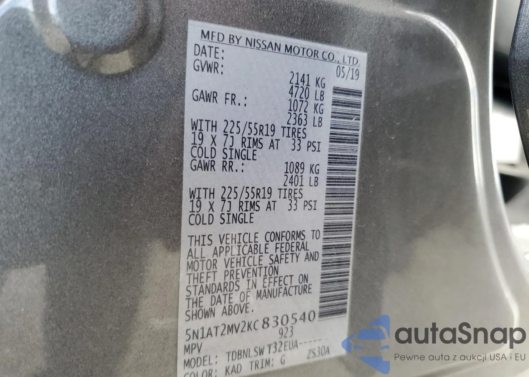 LOT: 86589945 VIN: 5N1AT2MV2KC830540