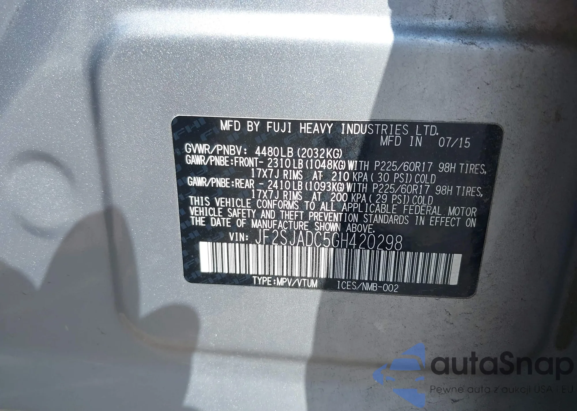 LOT: 43315408 VIN: JF2SJADC5GH420298