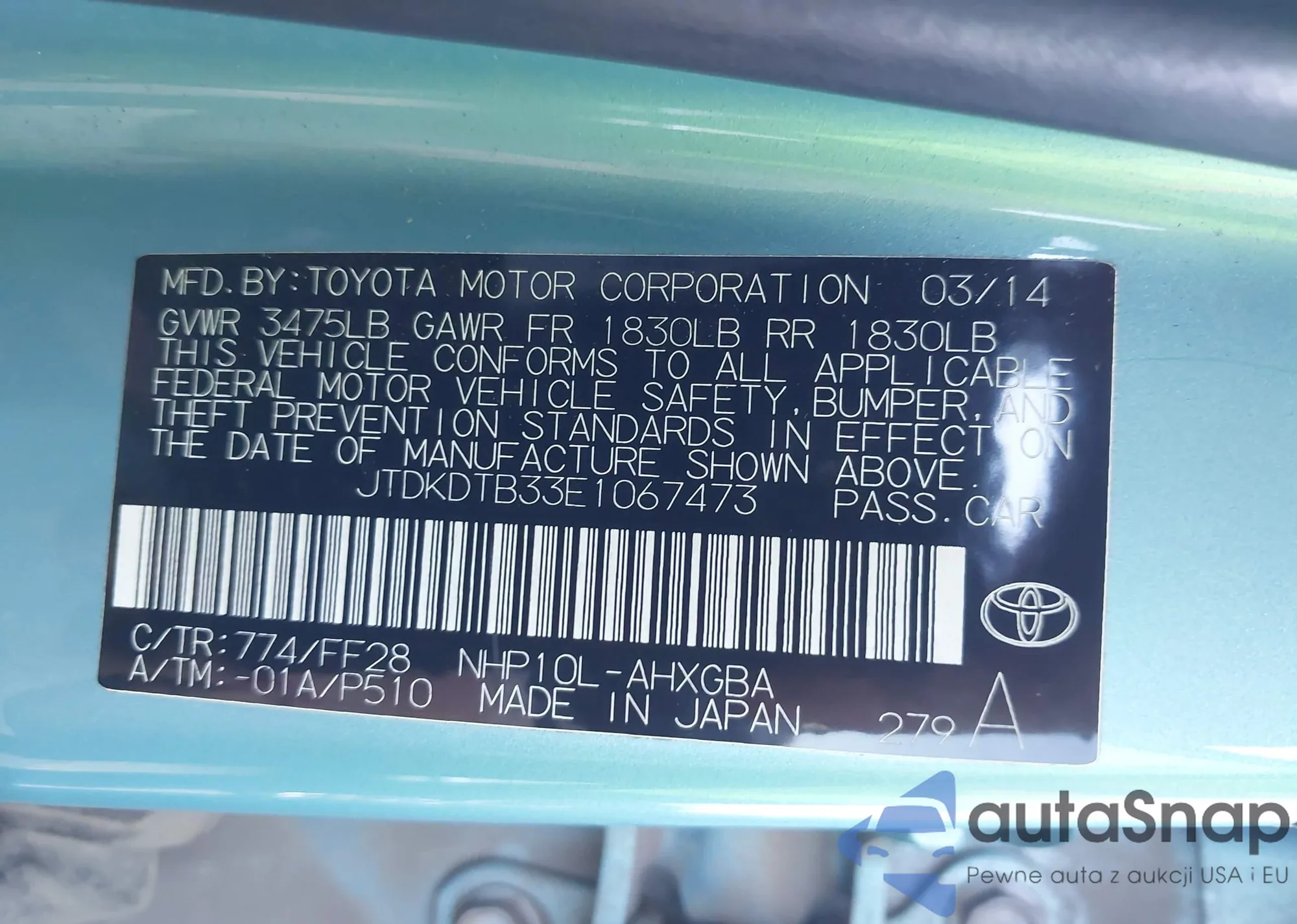 LOT: 43455355 VIN: JTDKDTB33E1067473