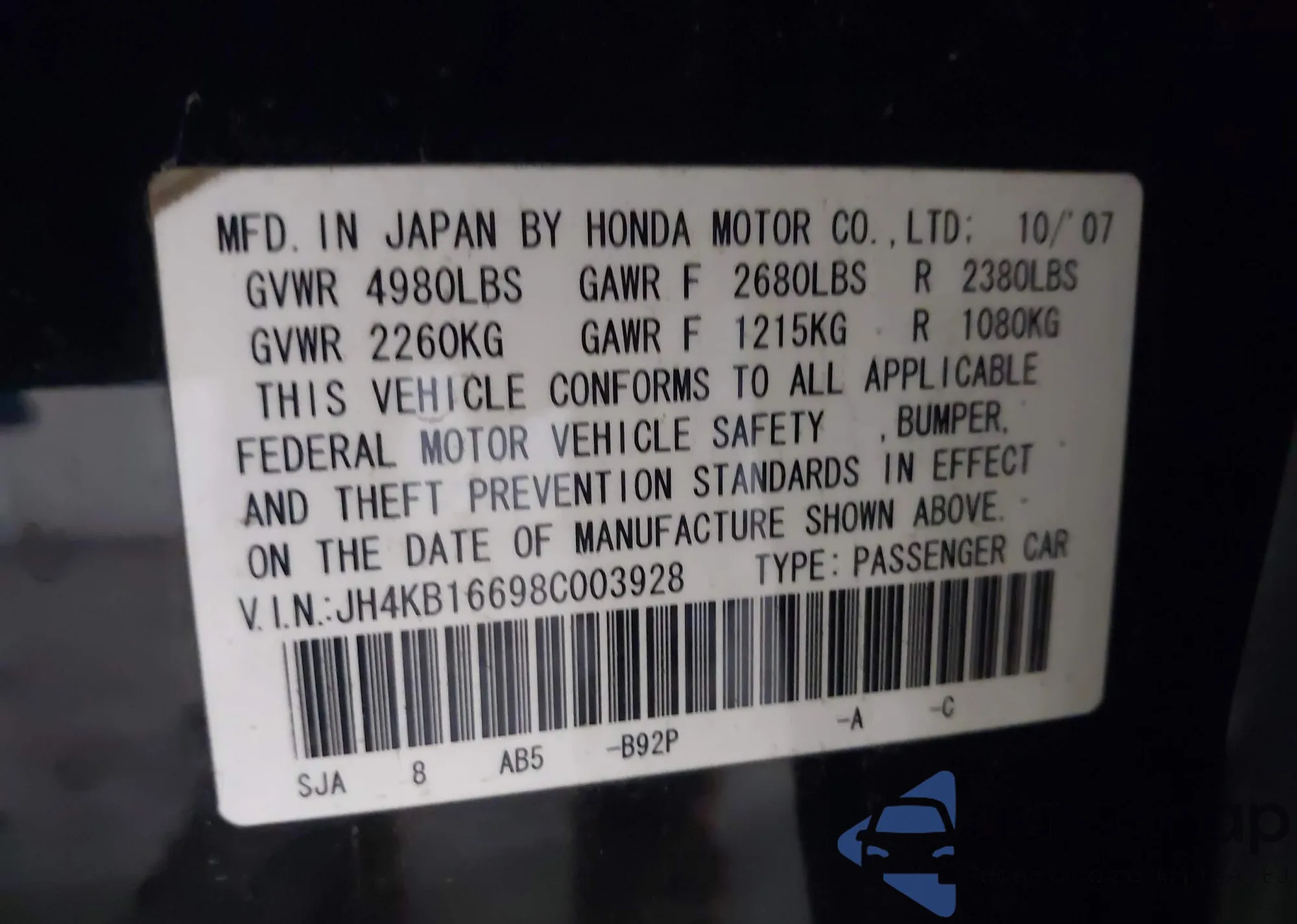 • VIN JH4KB16698C003928