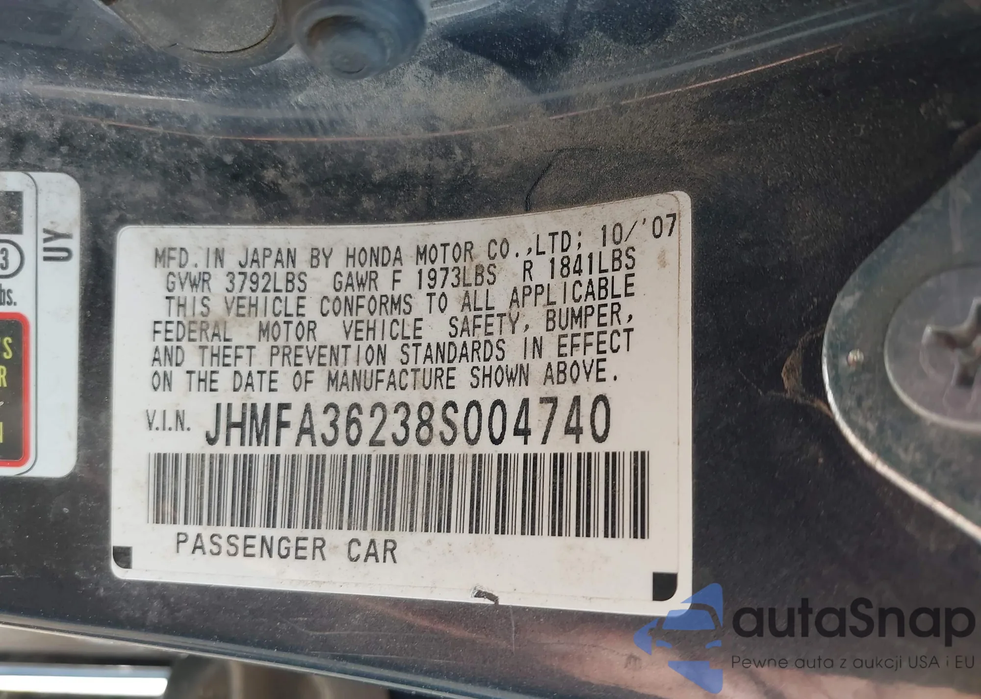 LOT: 43300741 VIN: JHMFA36238S004740
