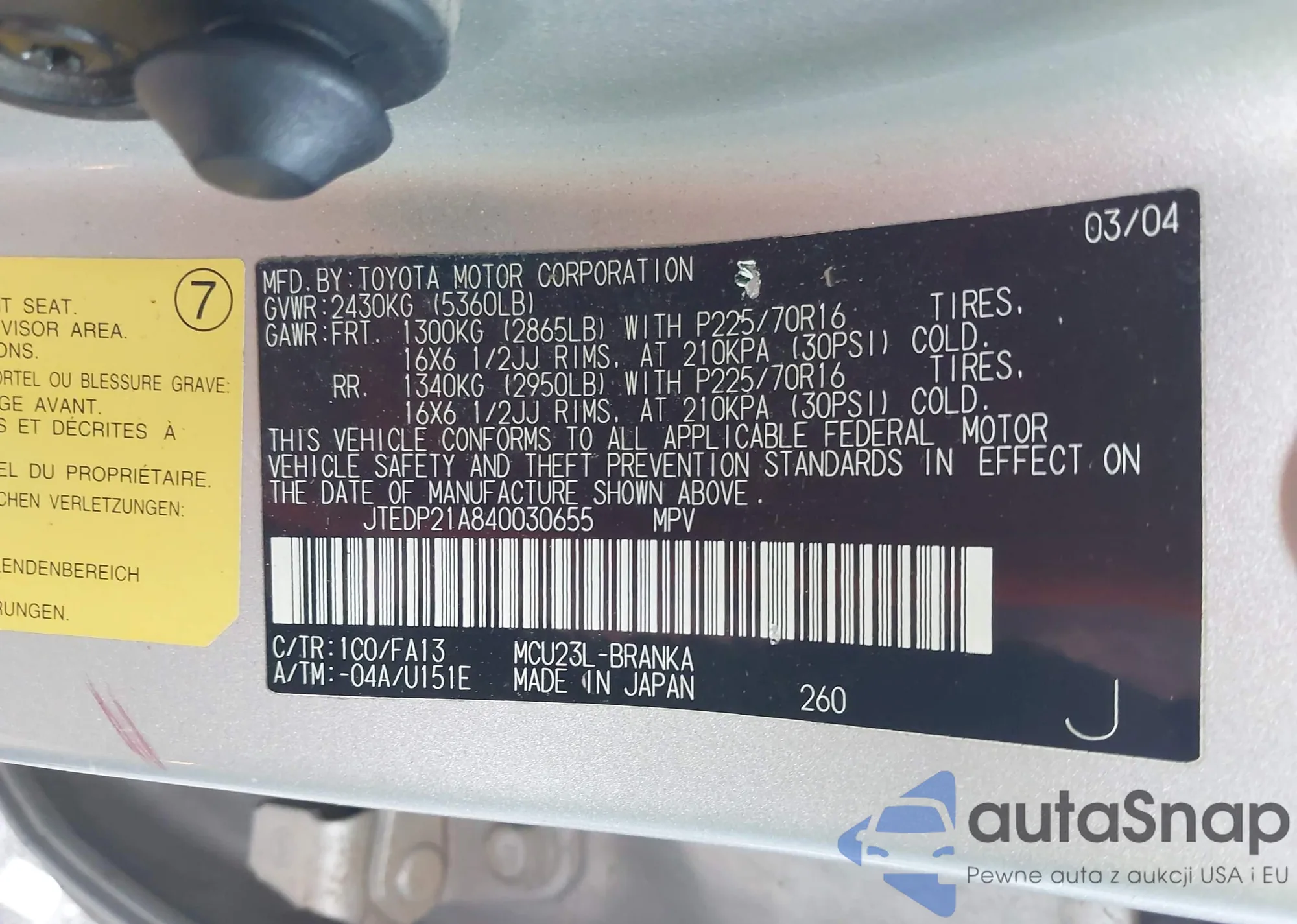 LOT: 43422550 VIN: JTEDP21A840030655