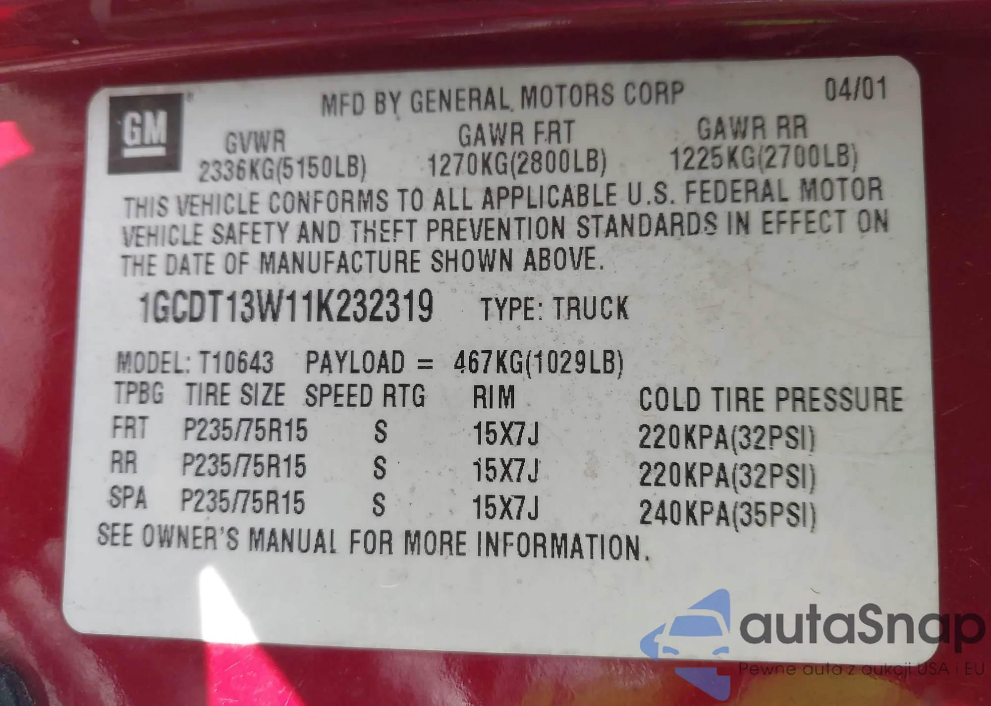 • VIN 1GCDT13W11K232319