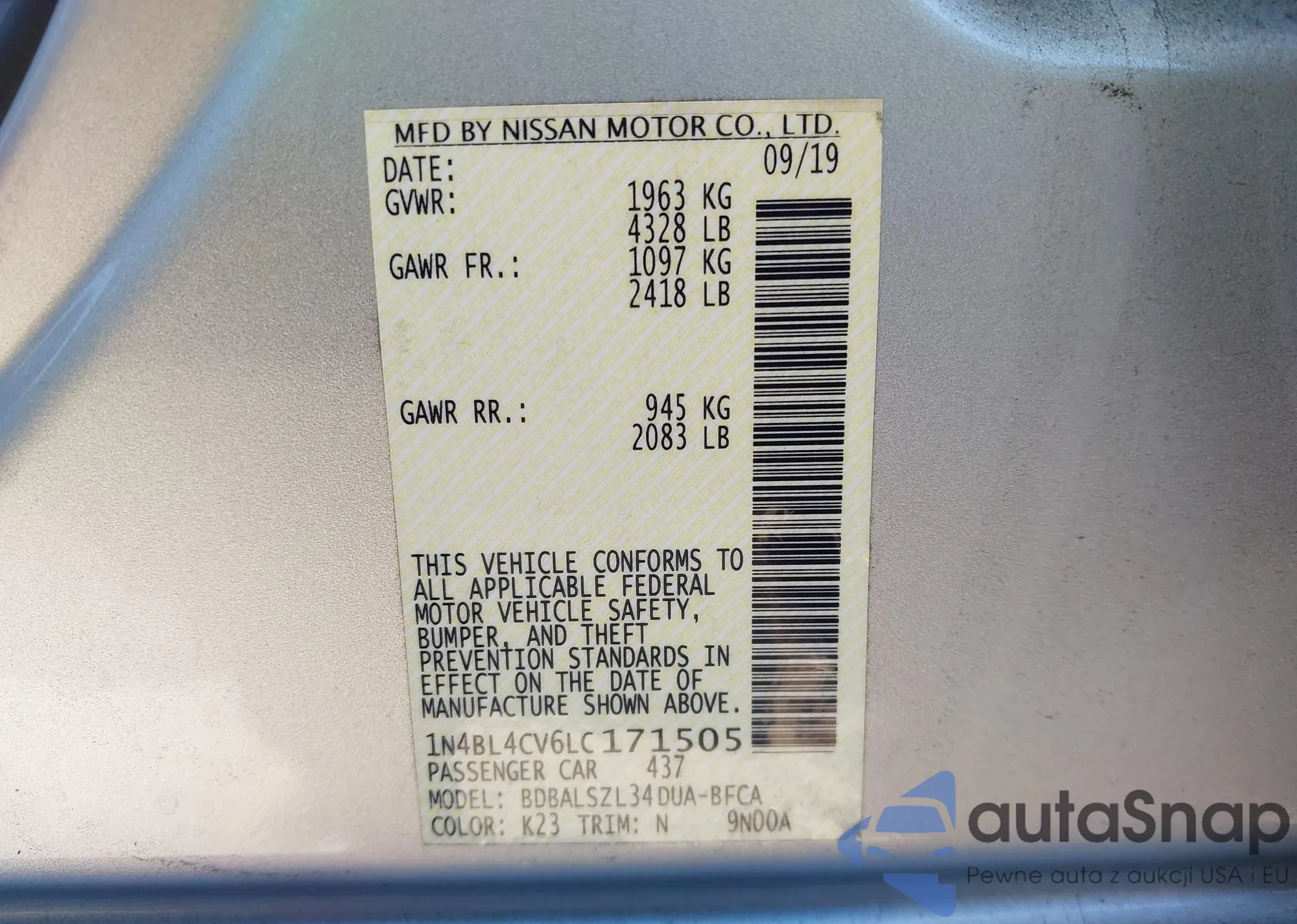 LOT: 43476381 VIN: 1N4BL4CV6LC171505