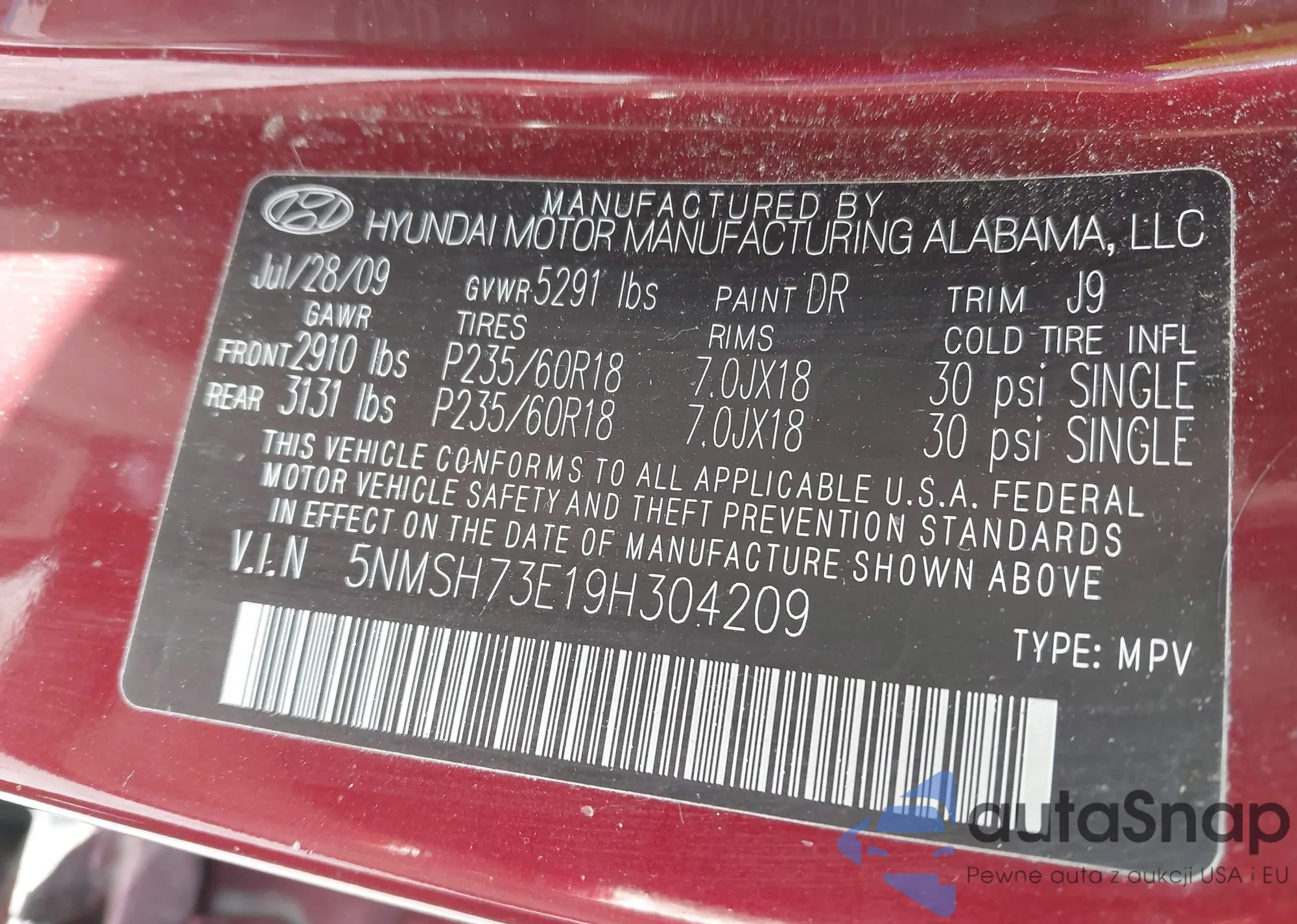 LOT: 43502139 VIN: 5NMSH73E19H304209