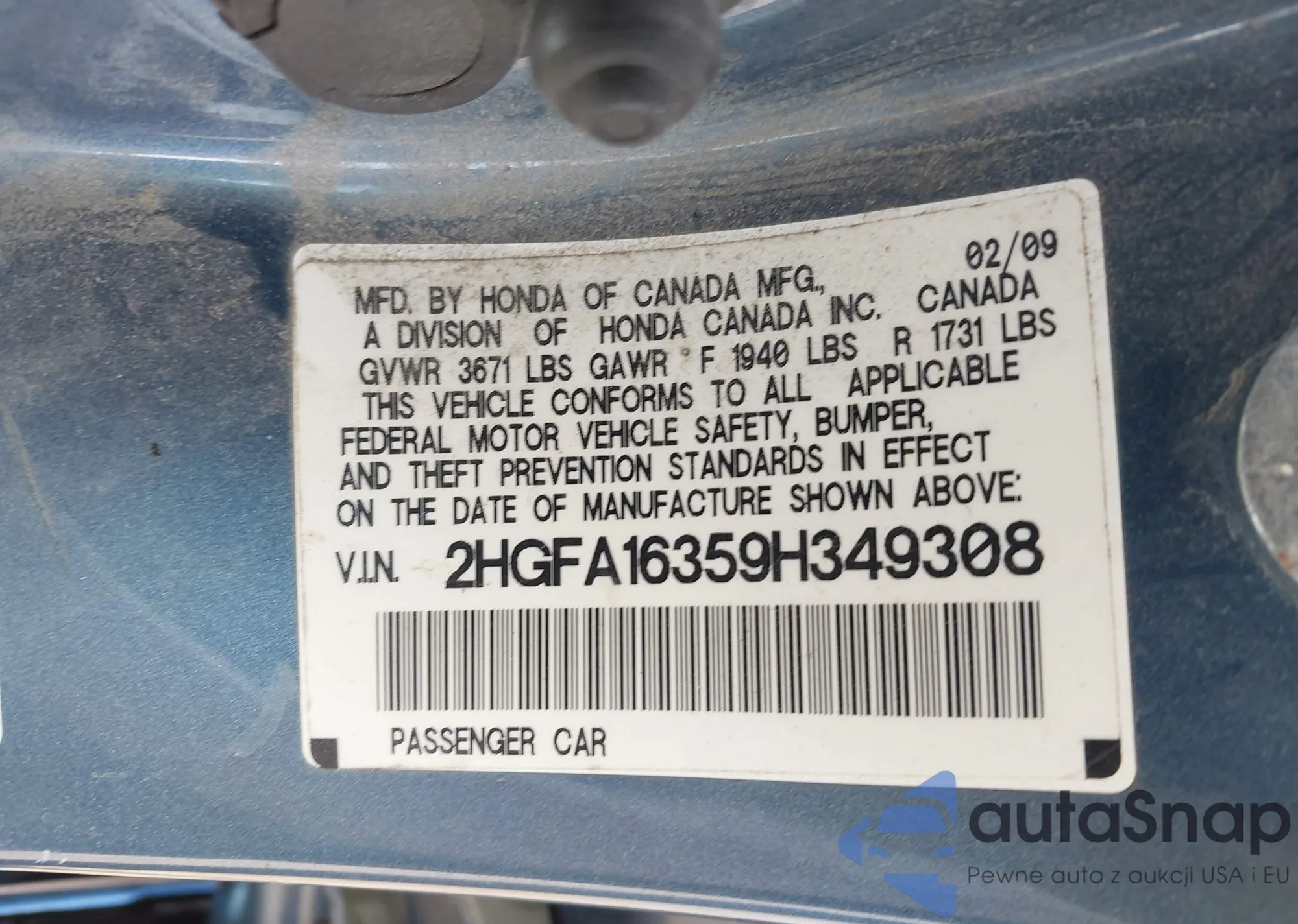 LOT: 43262895 VIN: 2HGFA16359H349308