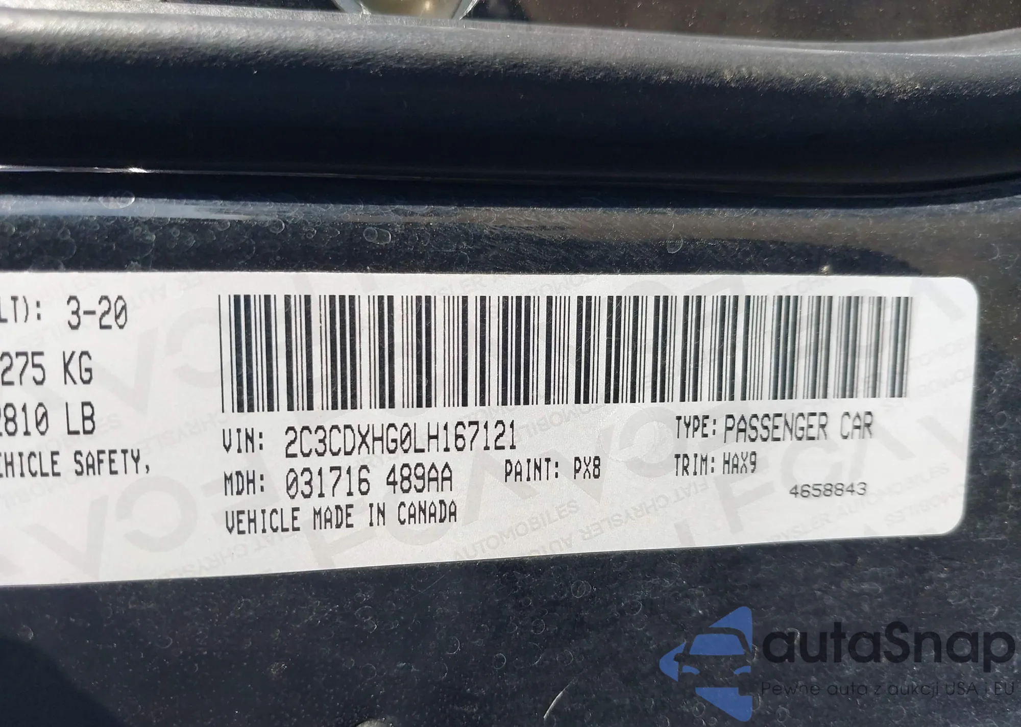 LOT: 43306277 VIN: 2C3CDXHG0LH167121