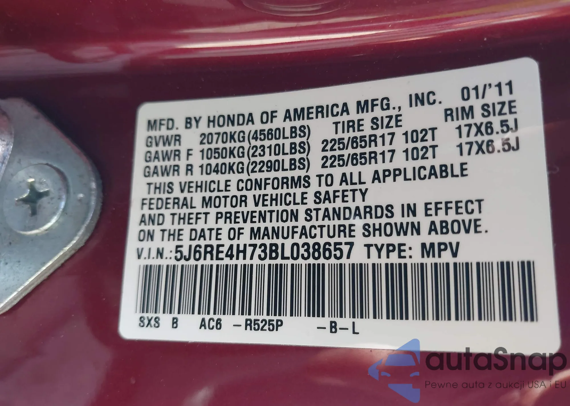 • VIN 2HKRW1H54LH401800
