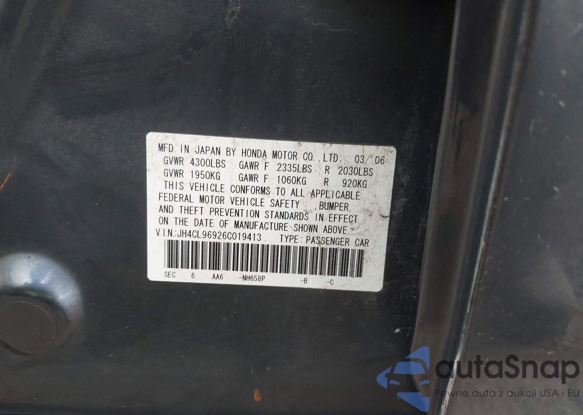 LOT: 43425248 VIN: JH4CL96926C019413