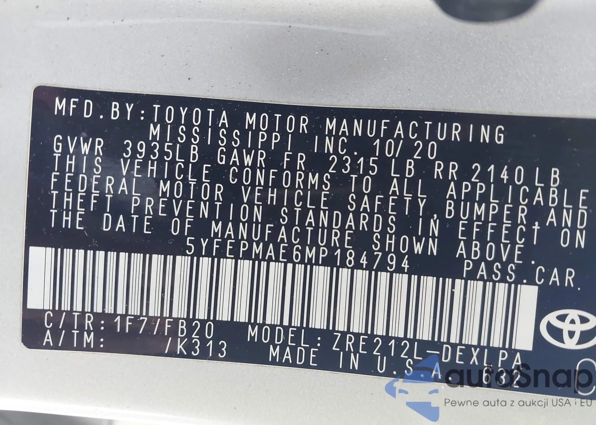 LOT: 43138157 VIN: 5YFEPMAE6MP184794