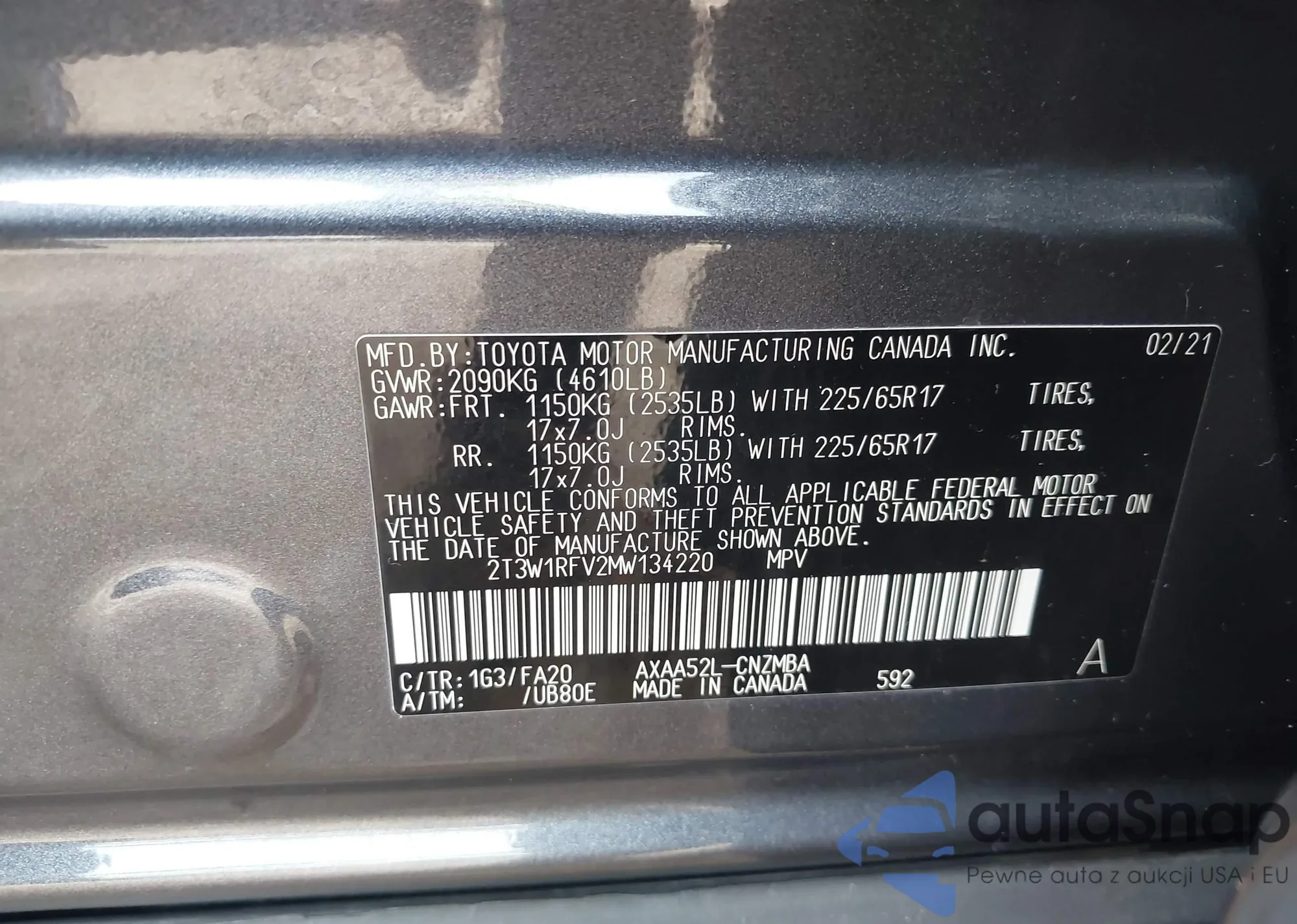 LOT: 43332189 VIN: 2T3W1RFV2MW134220
