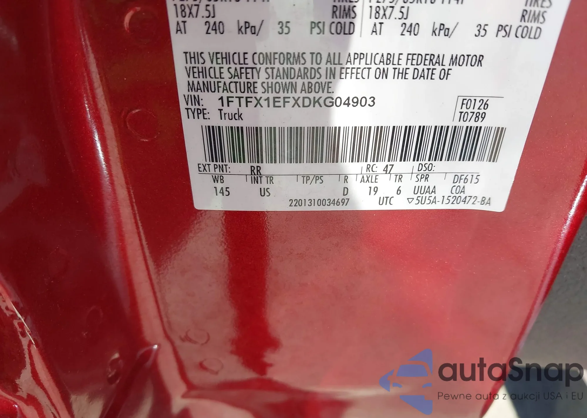 LOT: 43449561 VIN: 1FTFX1EFXDKG04903