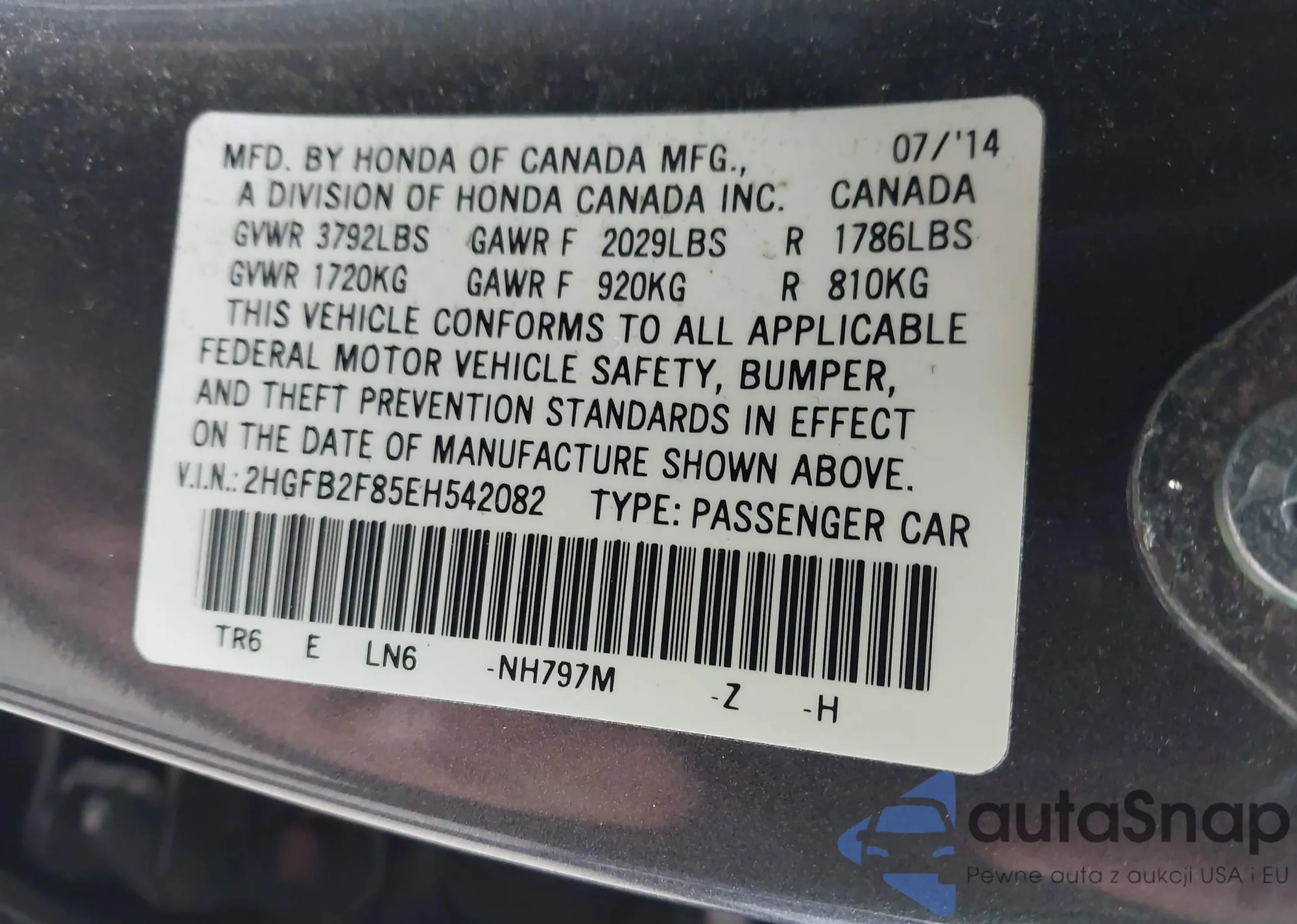 • VIN 2HGFB2F85EH542082