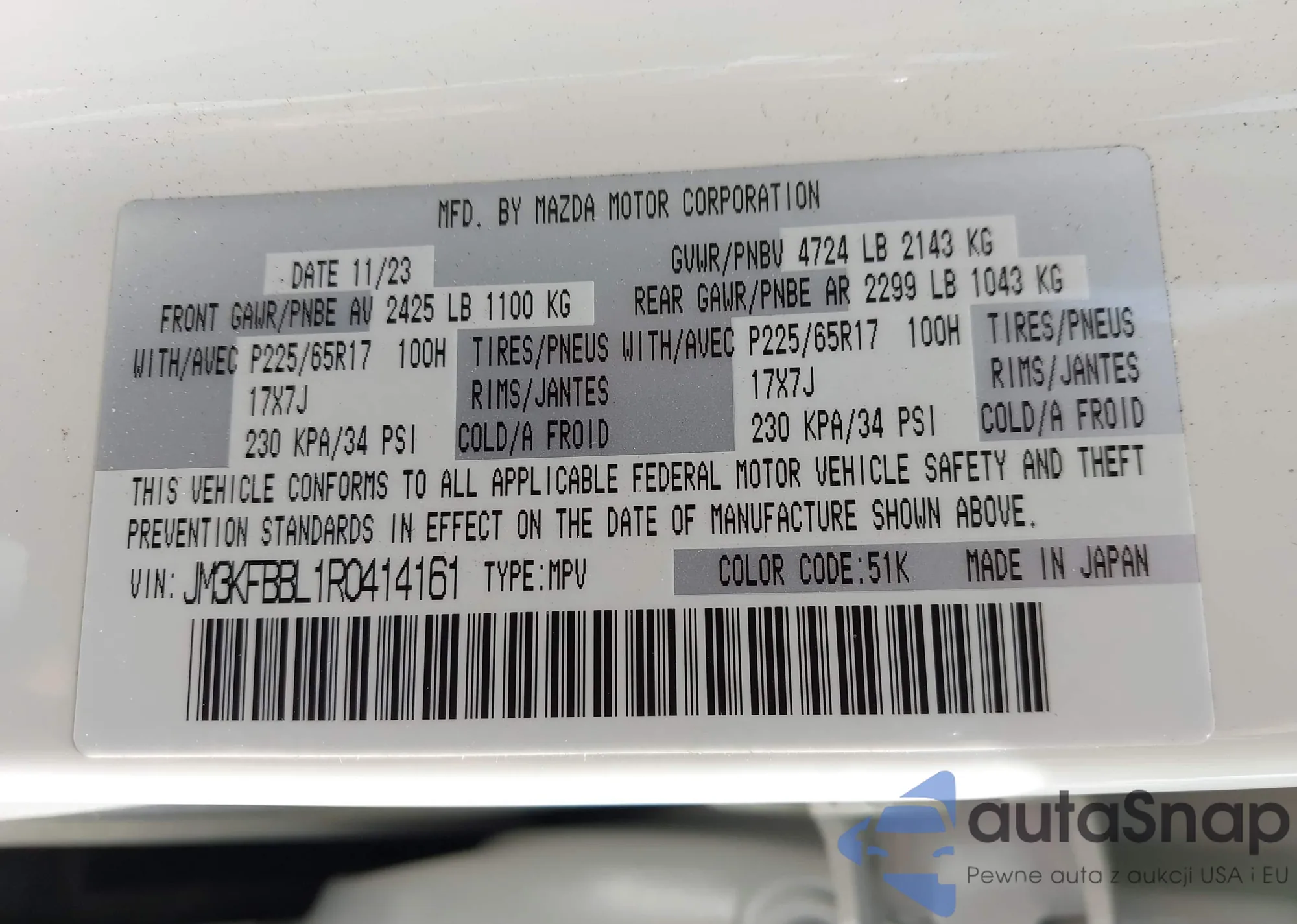 LOT: 43309931 VIN: JM3KFBBL1R0414161