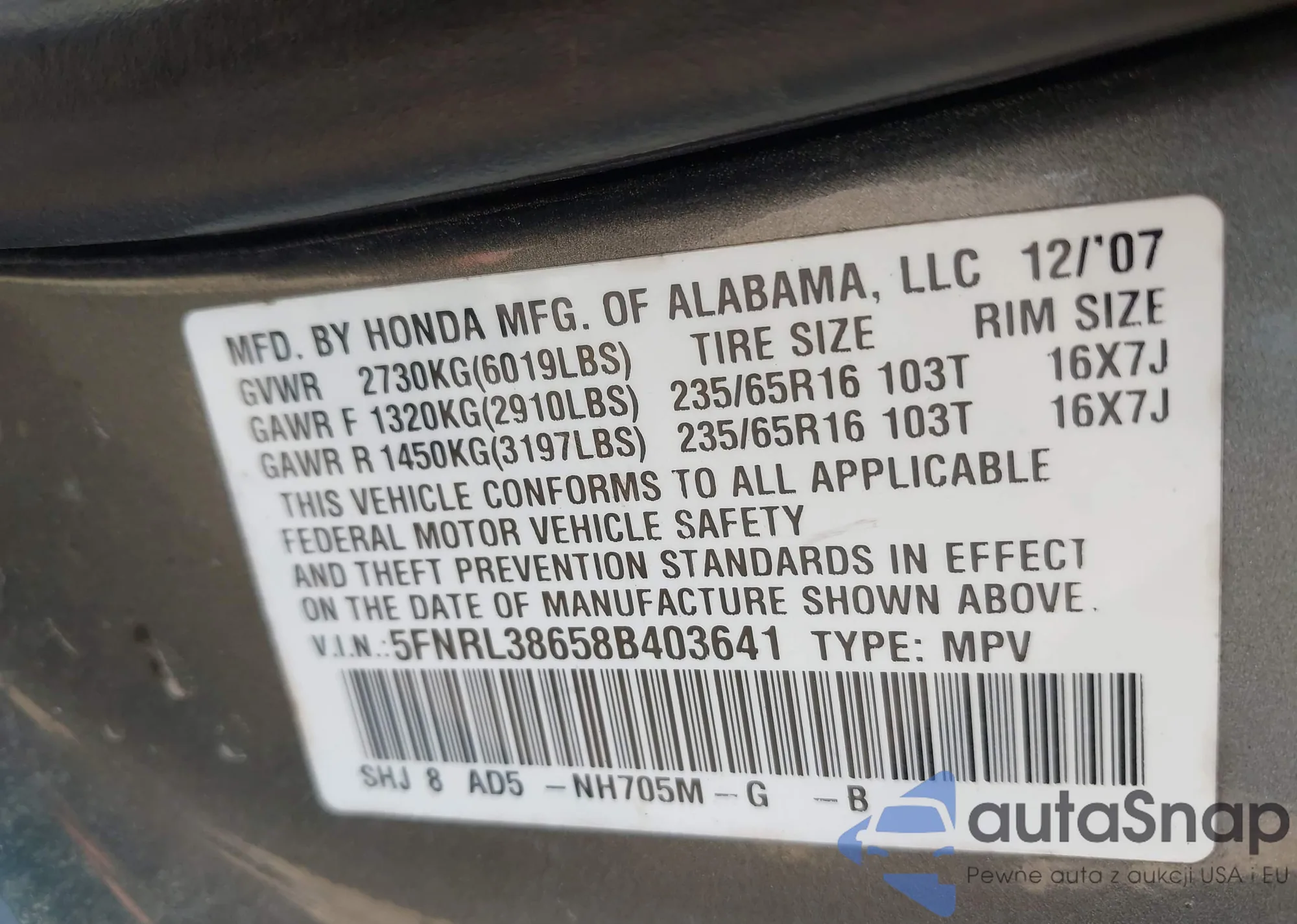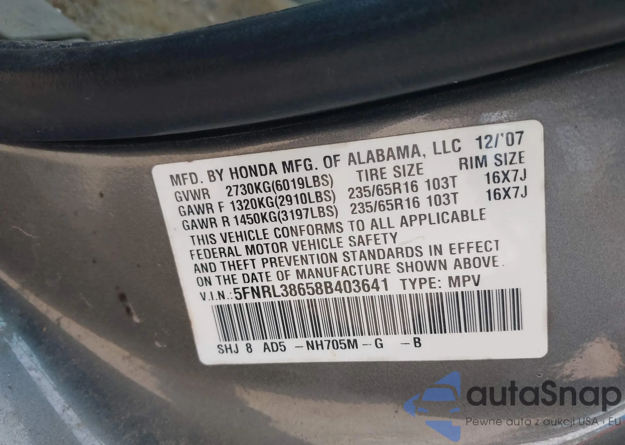 • VIN 5FNRL38658B403641