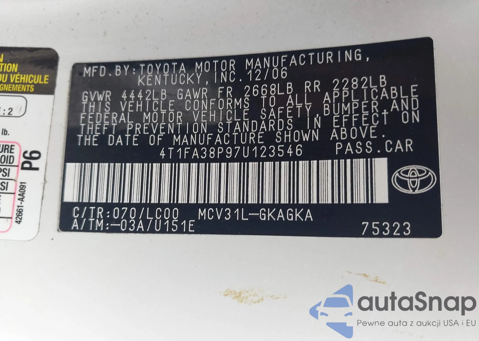 • VIN 4T1FA38P97U123546