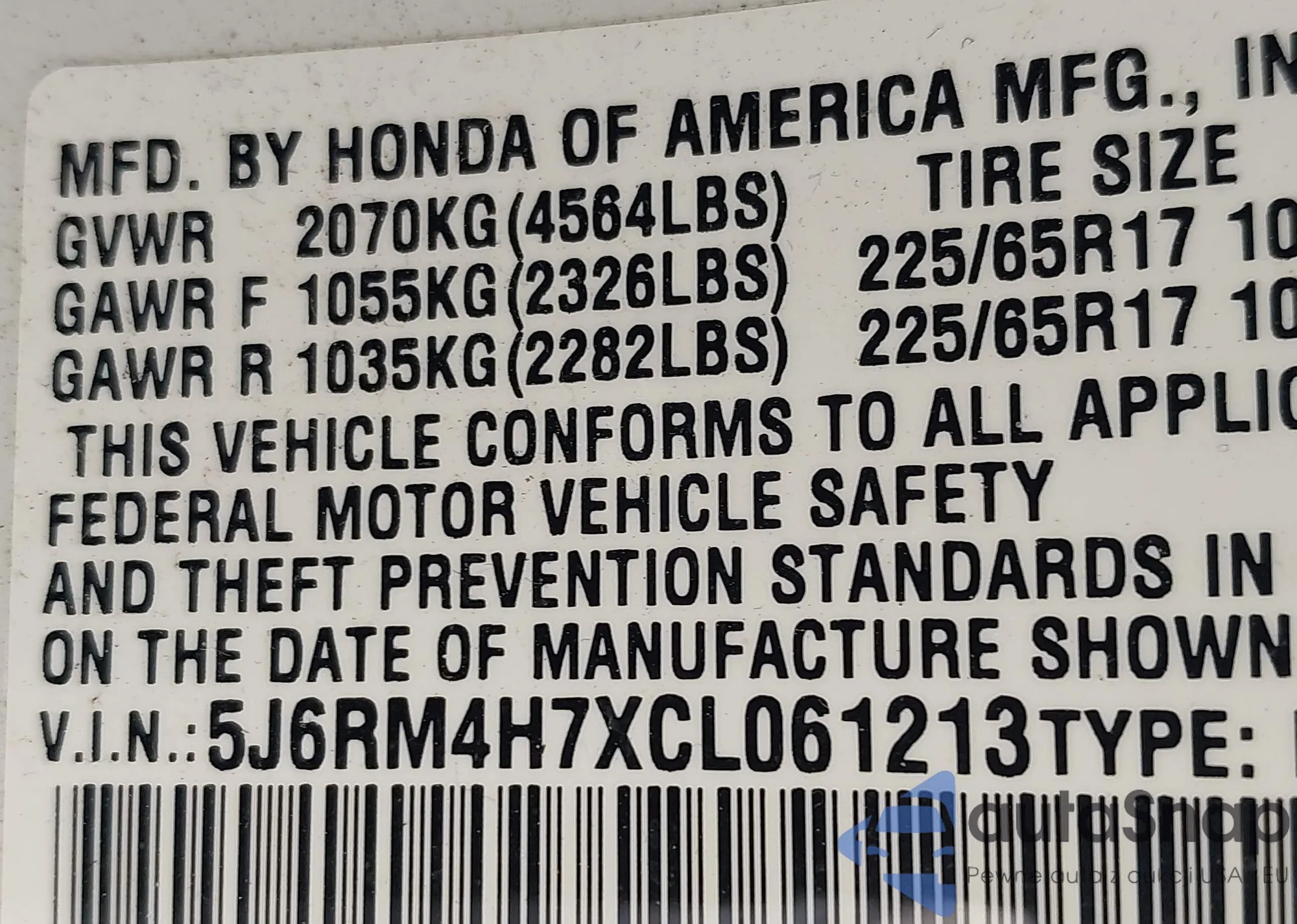 • VIN 5J6RM4H7XCL061213