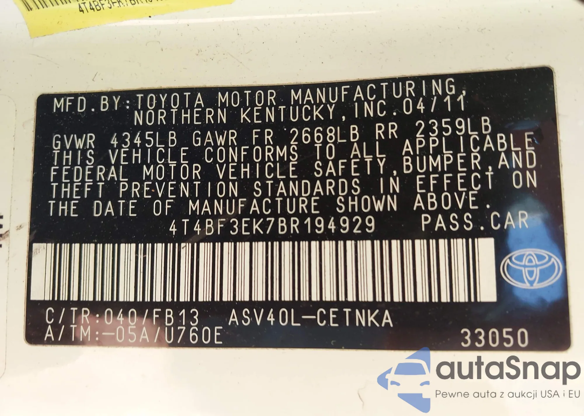 • VIN 4T4BF3EK7BR194929