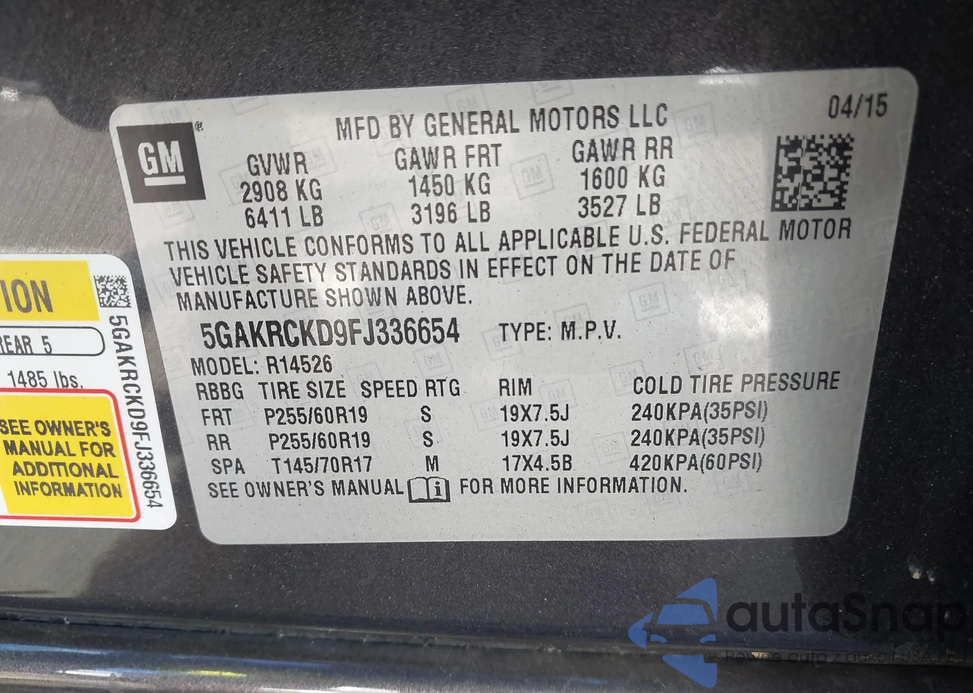 LOT: 43075120 VIN: 4S4BSALC8F3219483