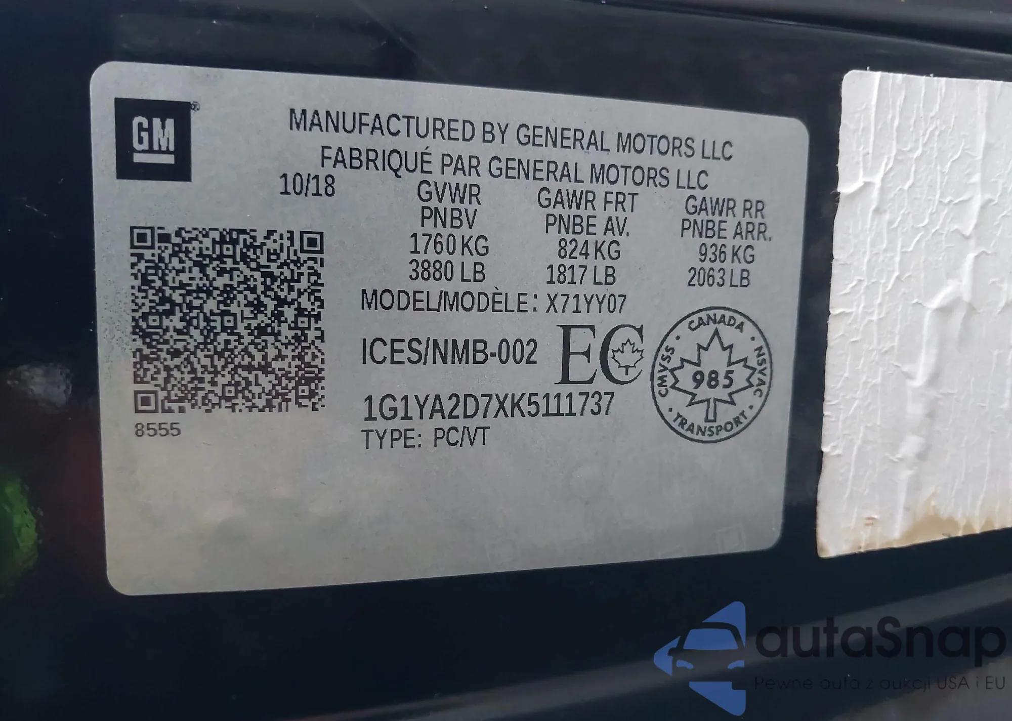 LOT: 43367387 VIN: 1G1YA2D7XK5111737