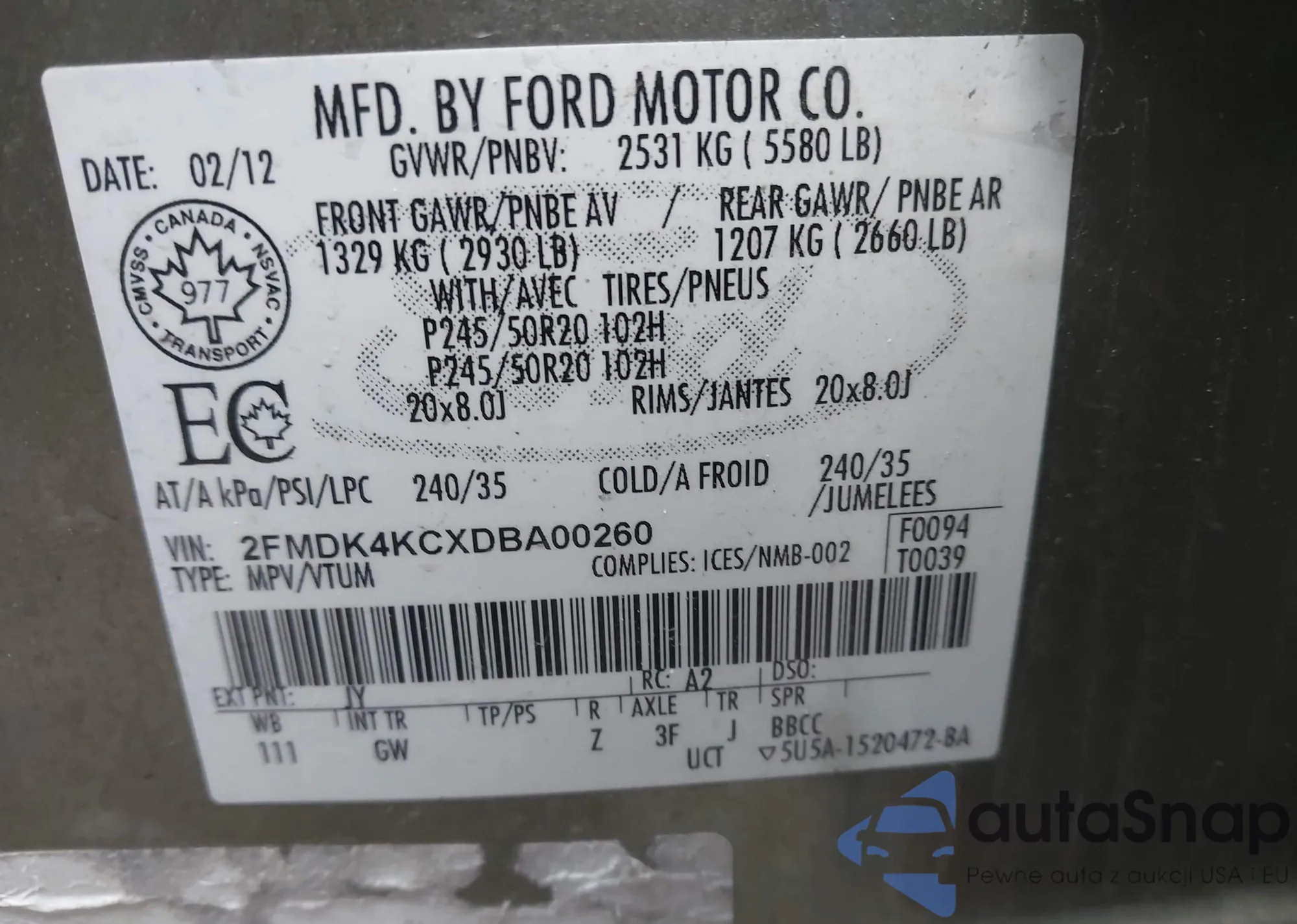 • VIN 2FMDK4KCXDBA00260
