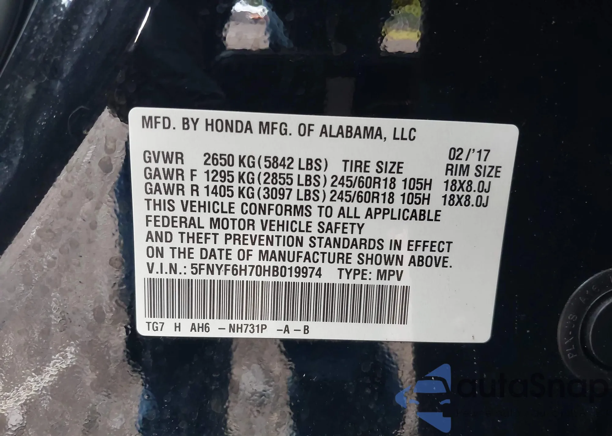 • VIN 5FNYF4H49BB057897