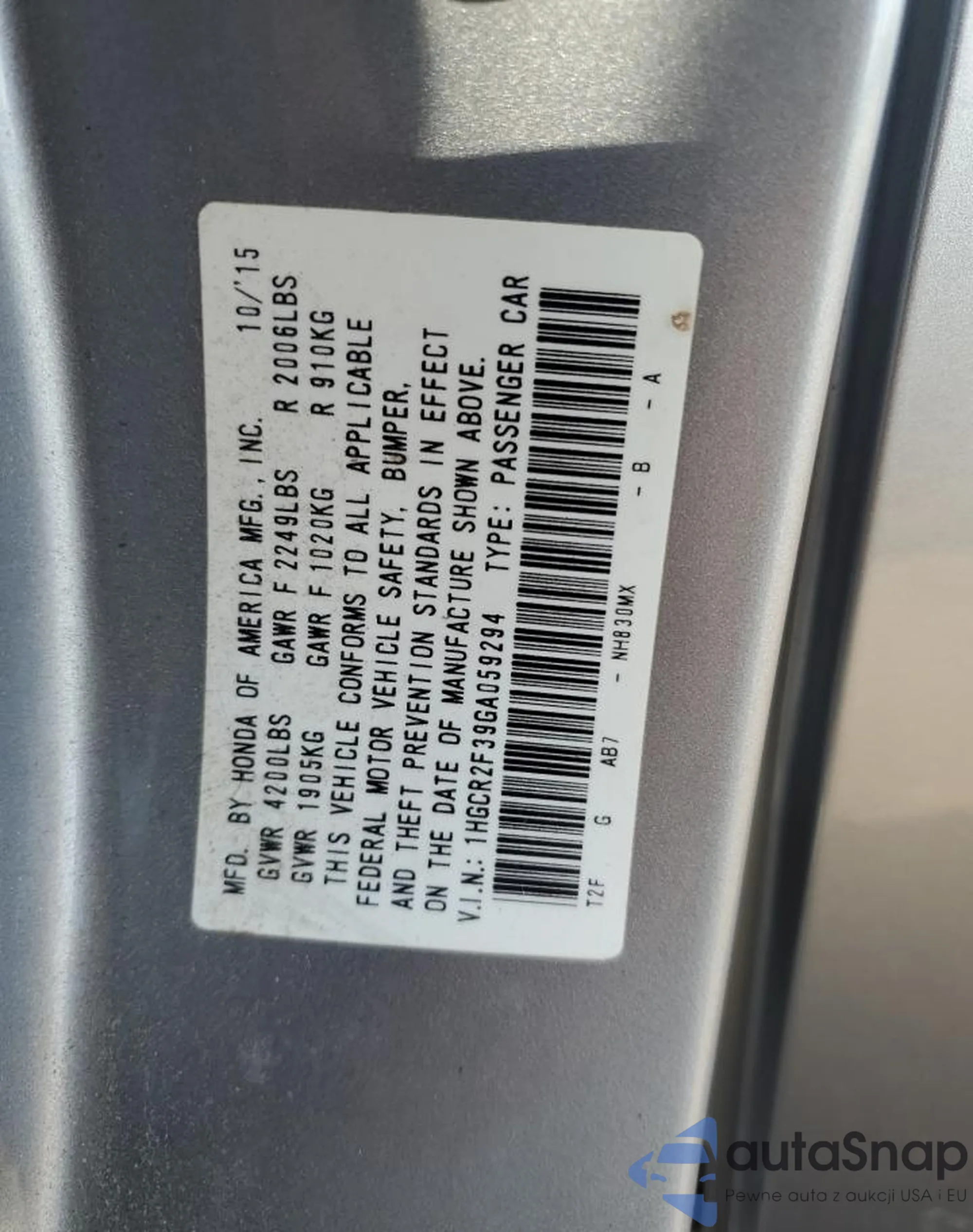 • VIN 1HGCR2F39GA059294