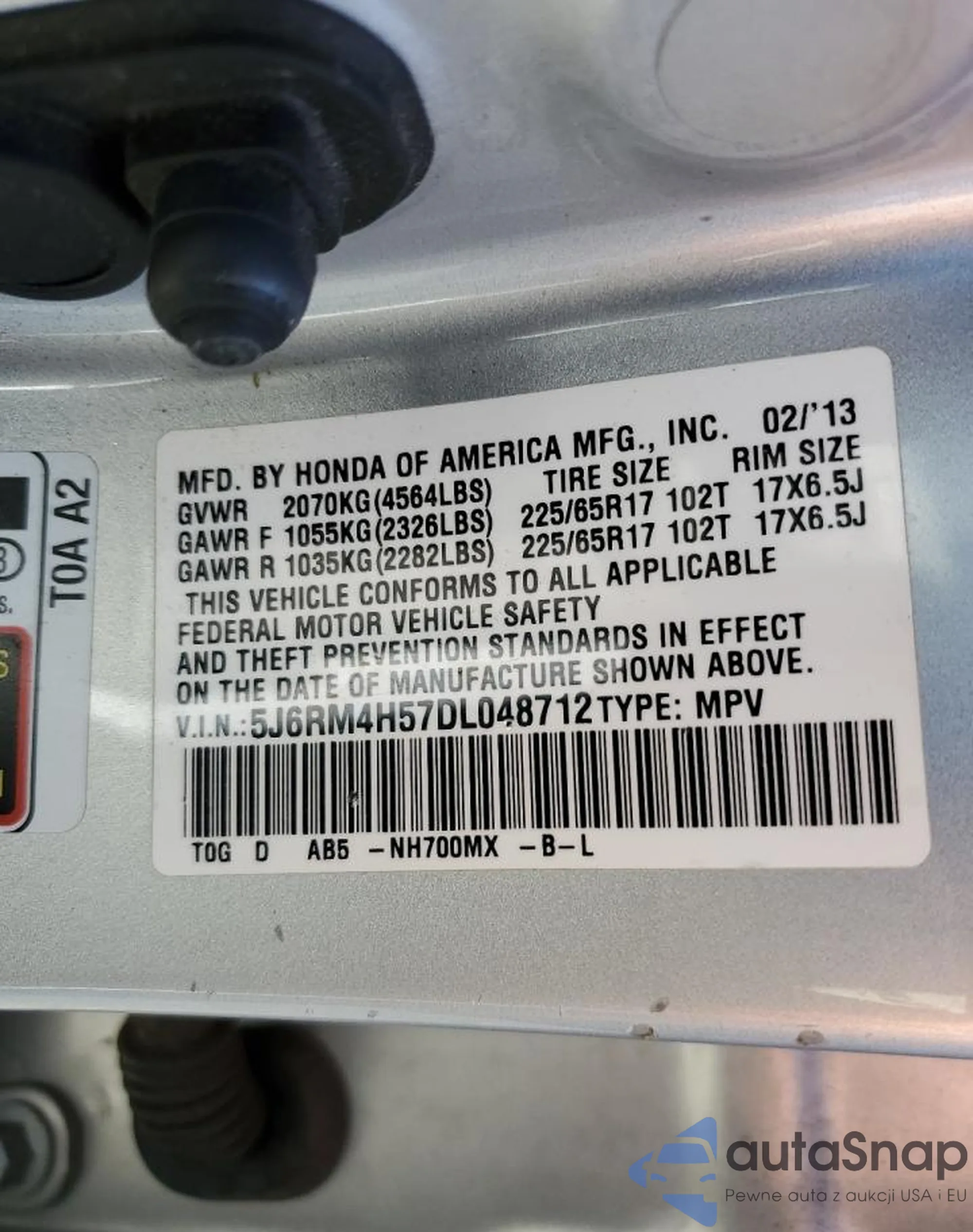 • VIN 5J6RM4H57DL048712
