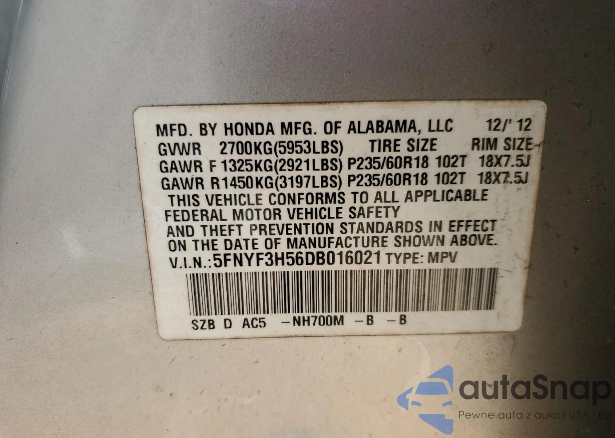• VIN 5FNYF3H56DB016021