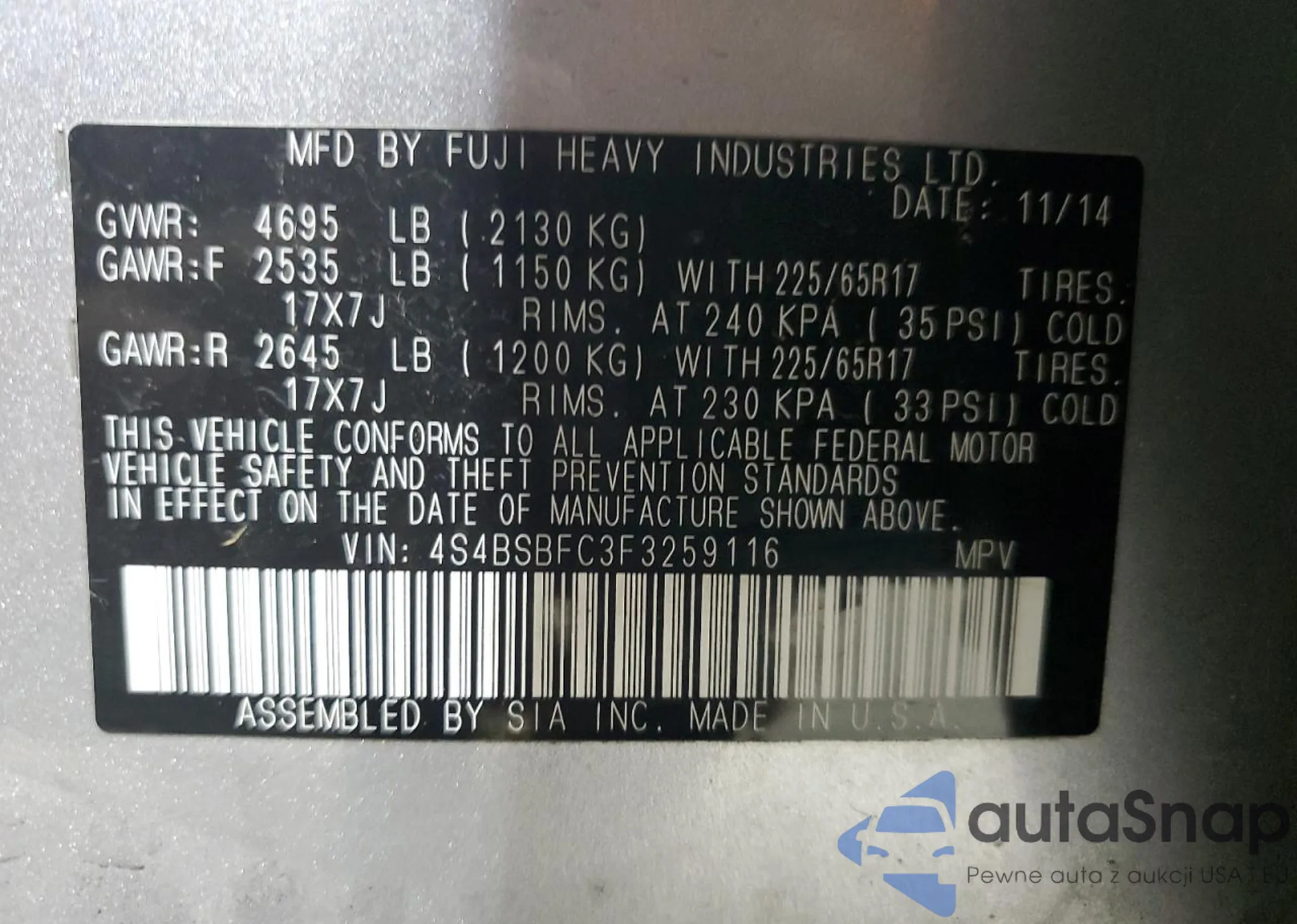 • VIN 4S4BSBFC3F3259116