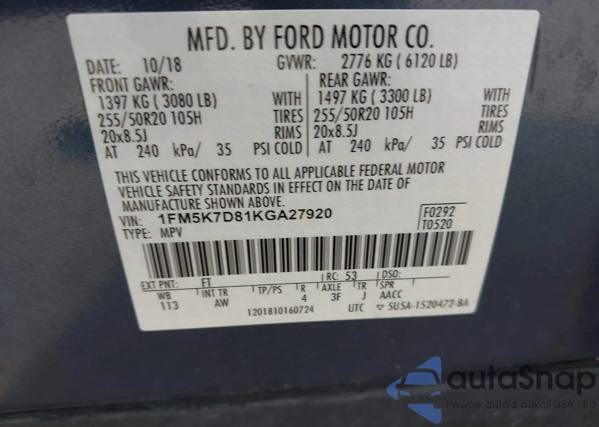 • VIN 1FM5K7D81KGA27920
