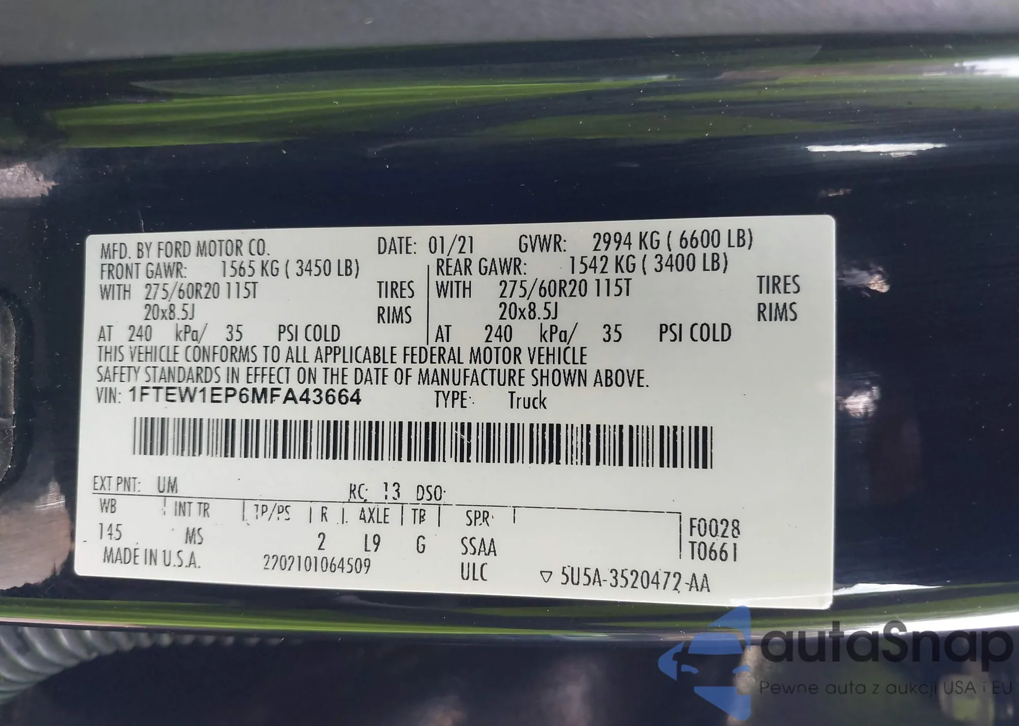 LOT: 43165471 VIN: 1FTEW1EP6MFA43664