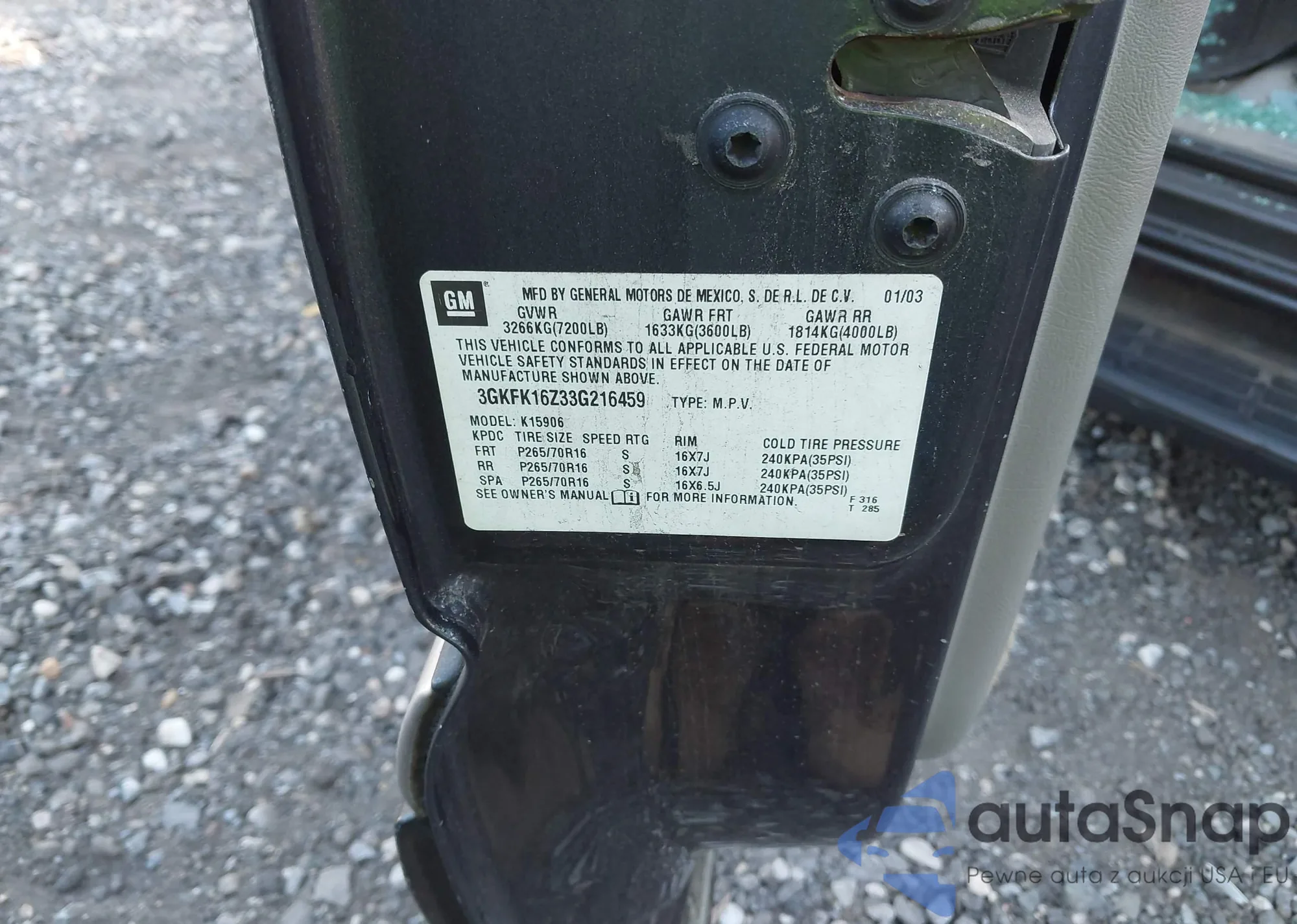 • VIN 3GKFK16Z33G216459