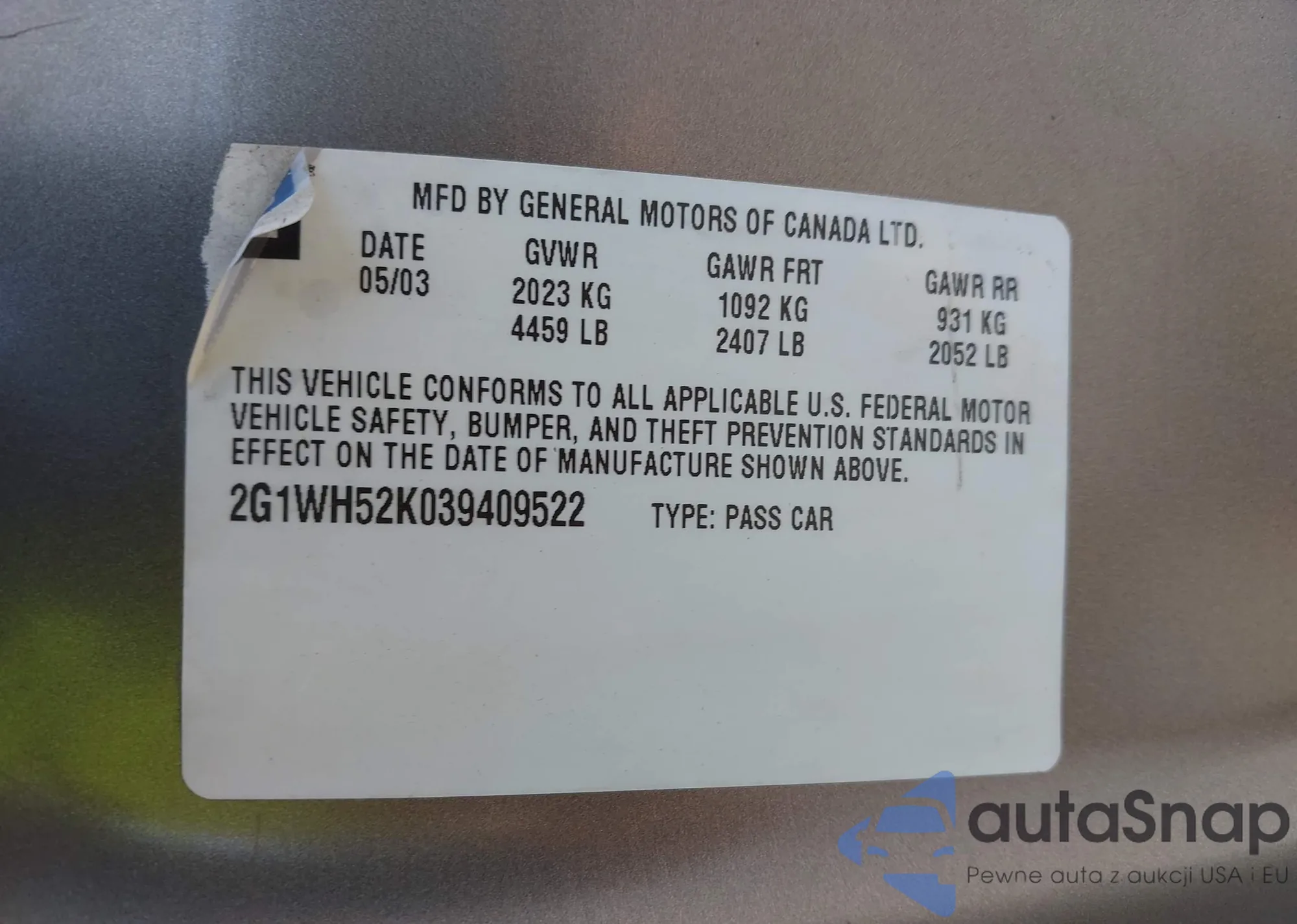 • VIN 2G1WH52K039409522