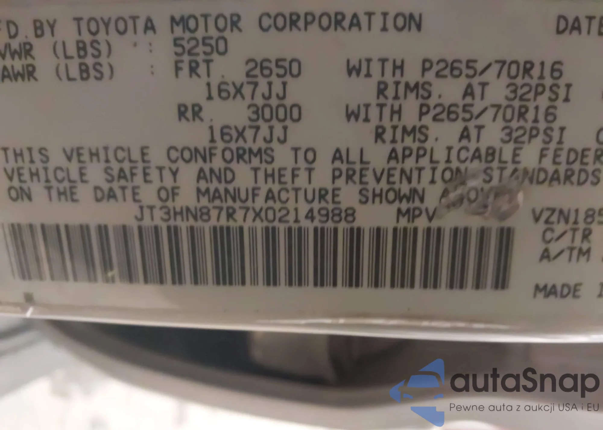 LOT: 41408184 VIN: JT3HN87R7X0214988