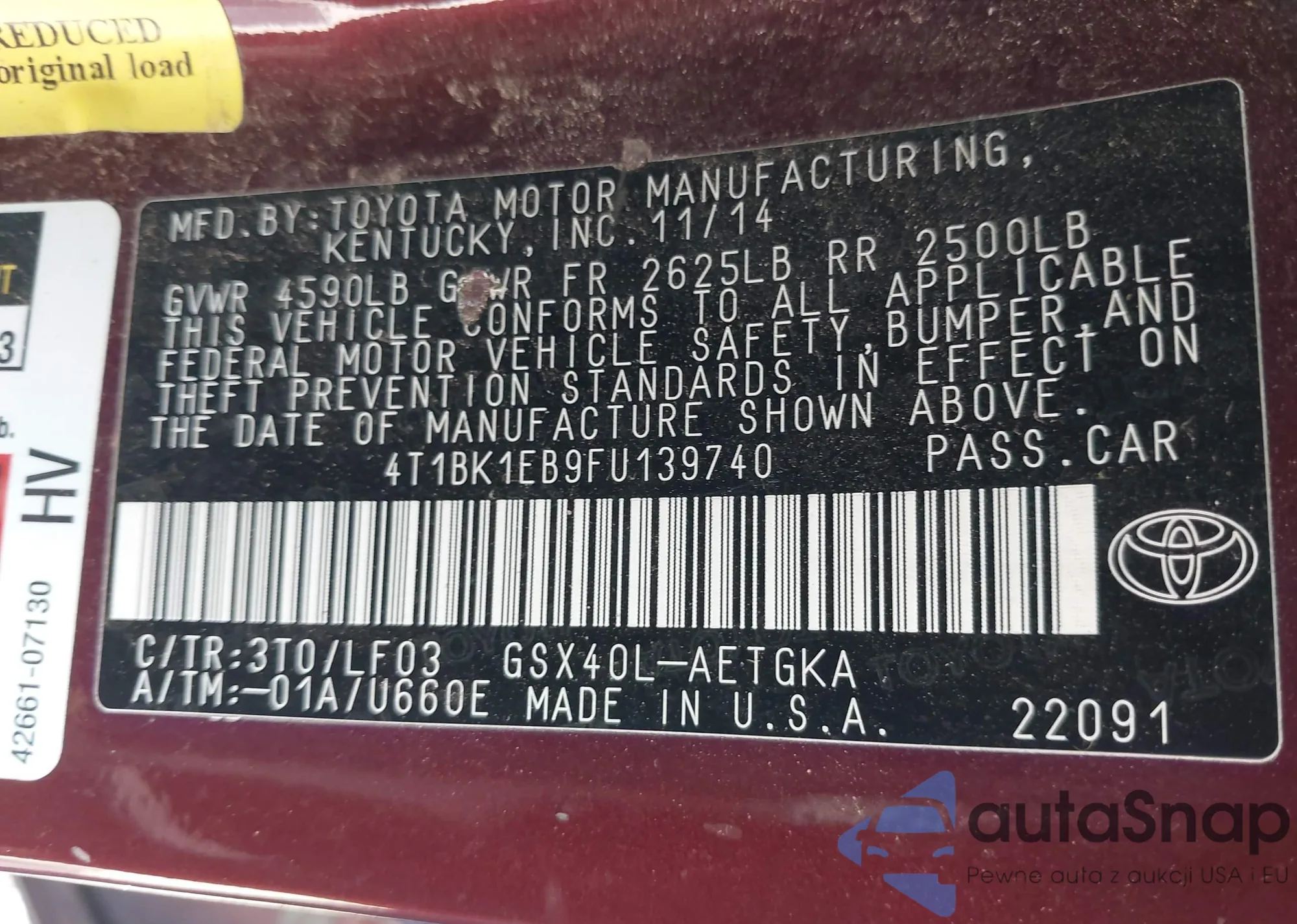 LOT: 43039465 VIN: 4T1BK1EB9FU139740
