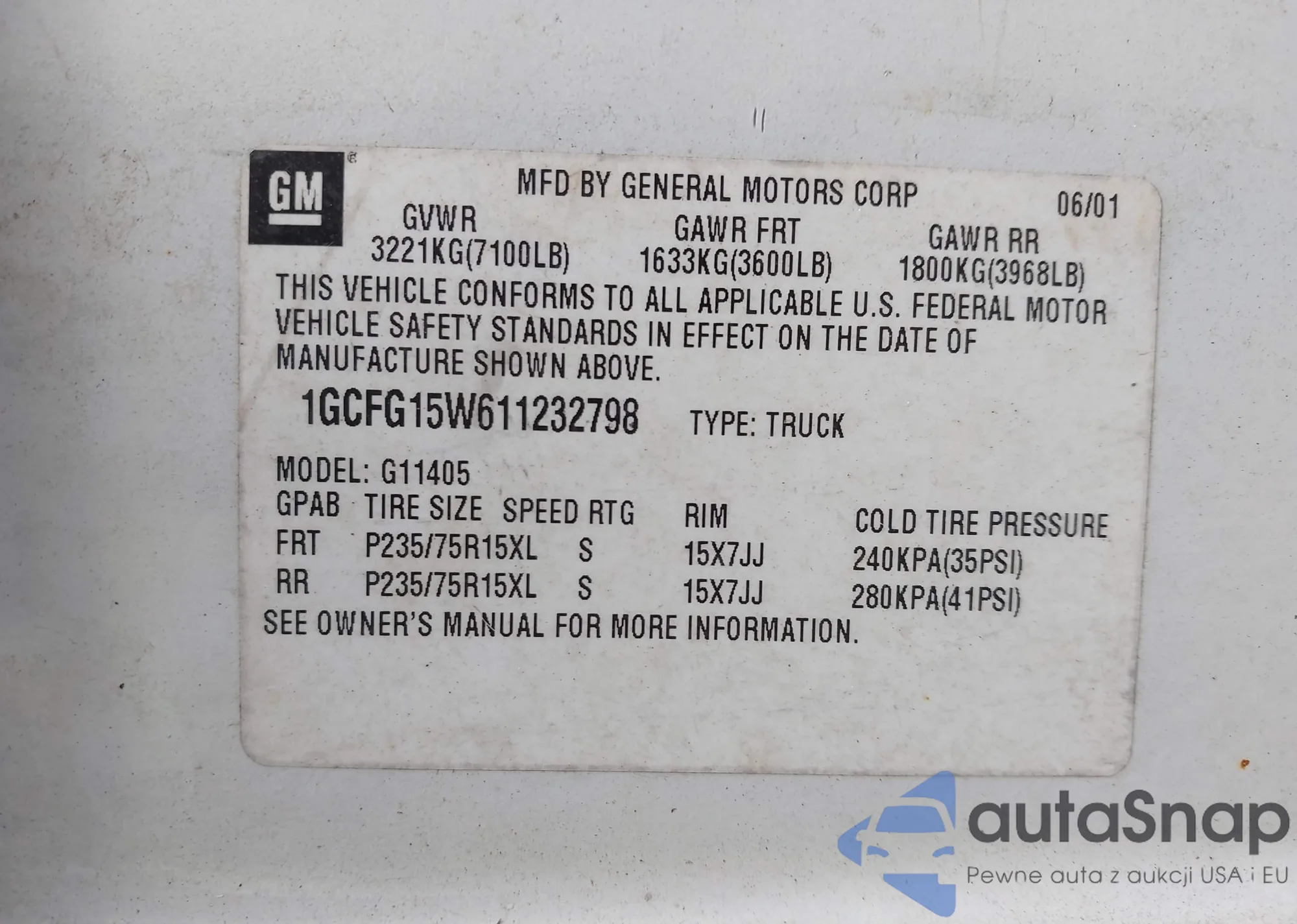 LOT: 43178280 VIN: 1GCFG15W611232798