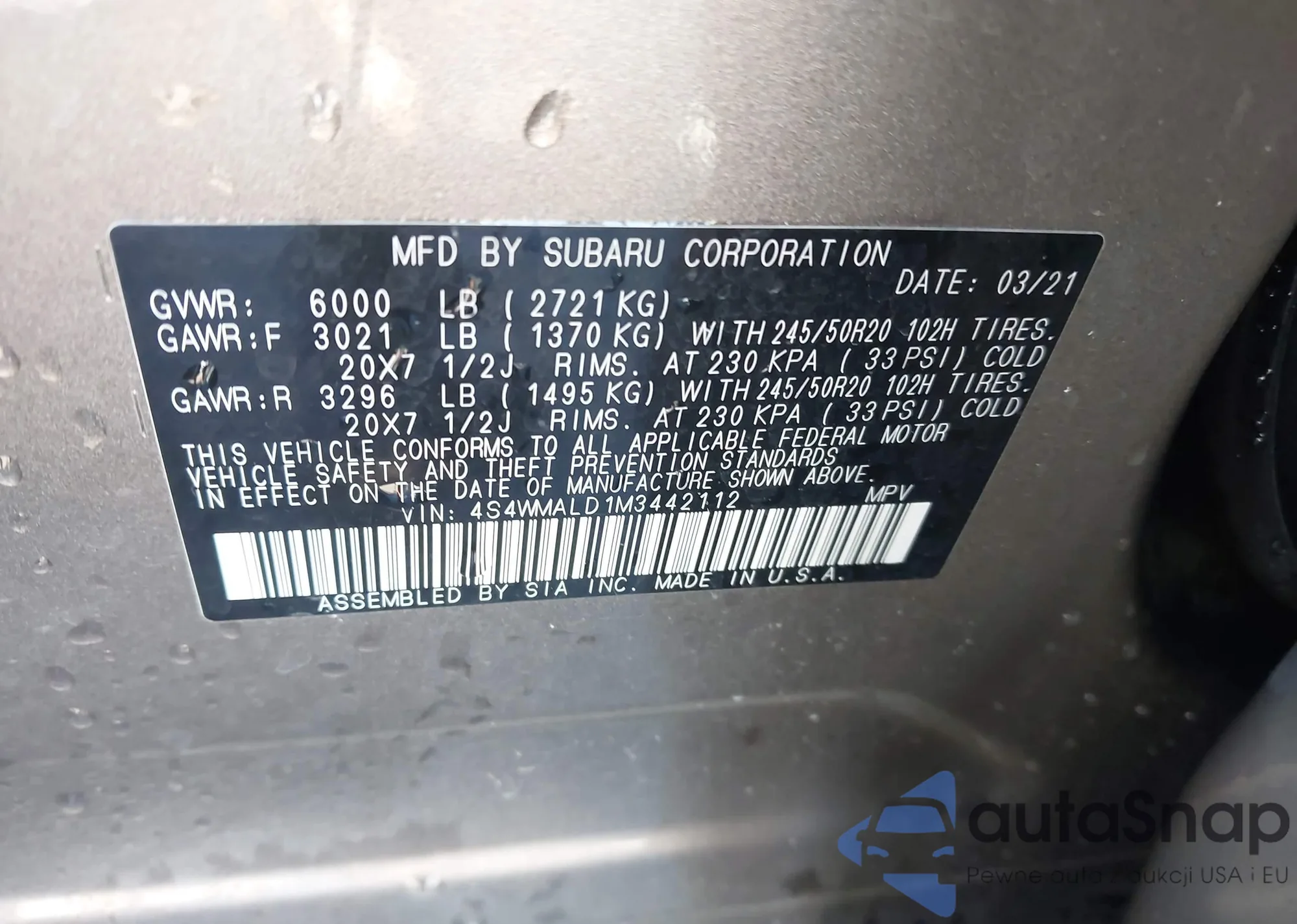 2021 Subaru Ascent Limited из США, поврежденный, VIN 4S4WMALD1M3442112