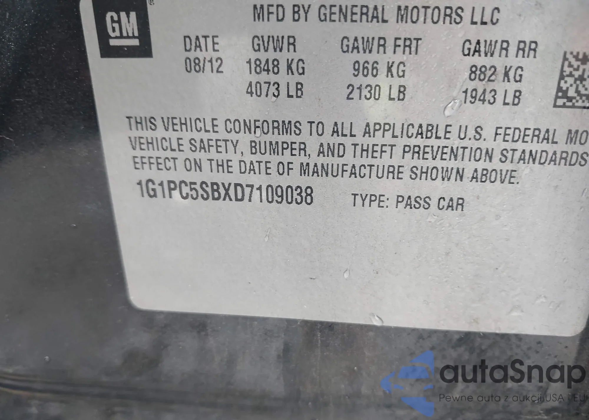 LOT: 43413290 VIN: 1G1PC5SBXD7109038