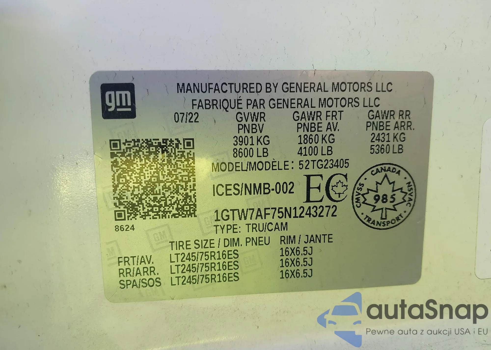 LOT: 42931760 VIN: 1GTW7AF75N1243272