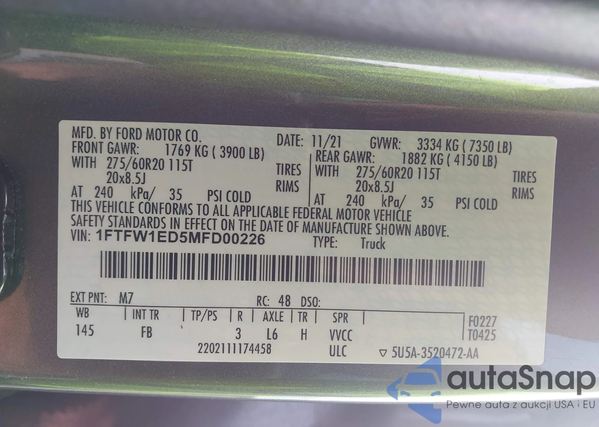 • VIN 1FTFW1ED5MFD00226