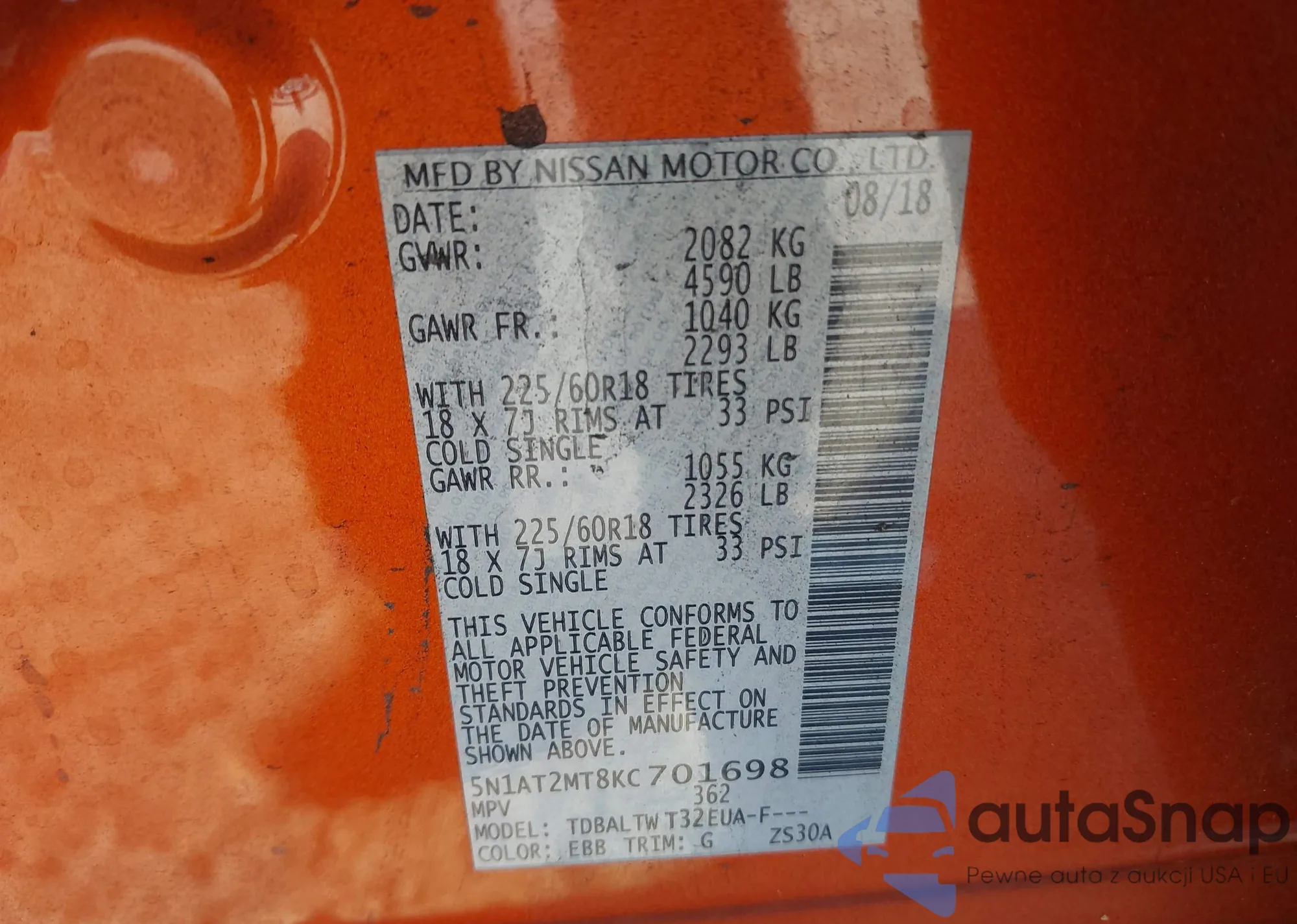 LOT: 43249580 VIN: 5N1AT2MT8KC701698
