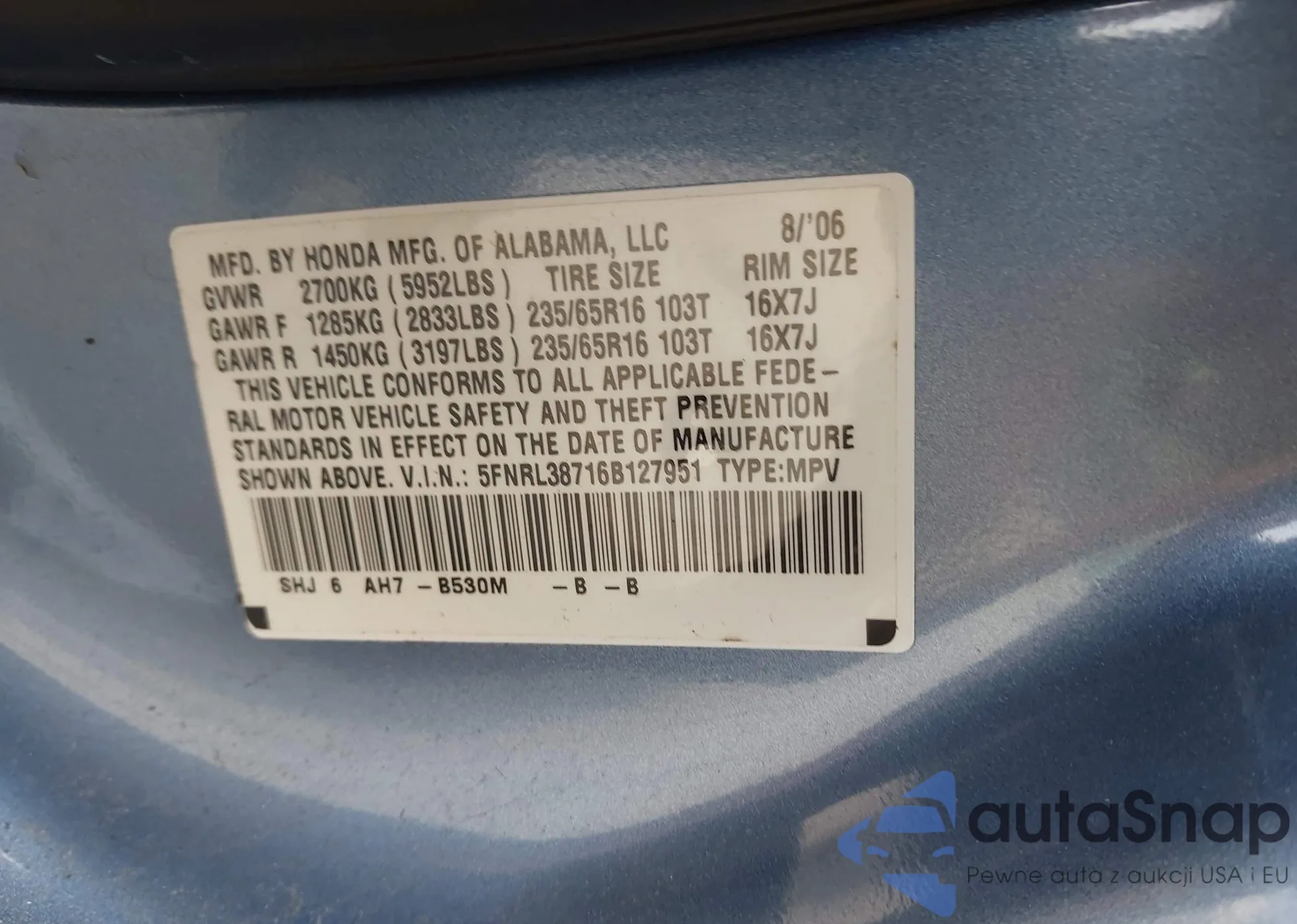 • VIN 5FNRL38716B127951