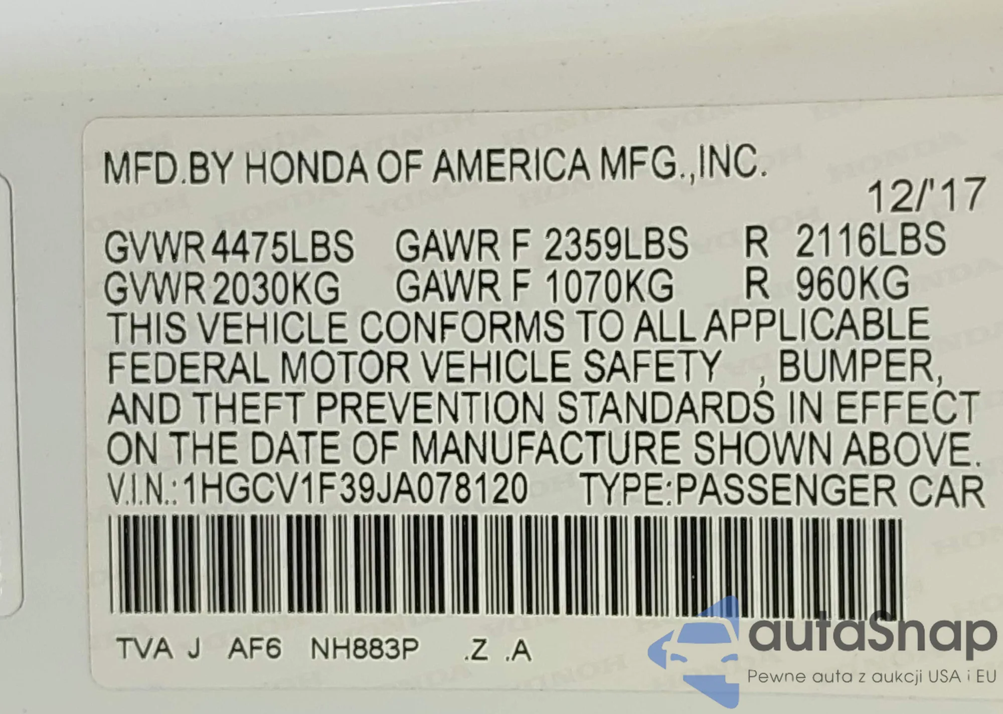 LOT: 43342489 VIN: 1HGCV1F39JA078120