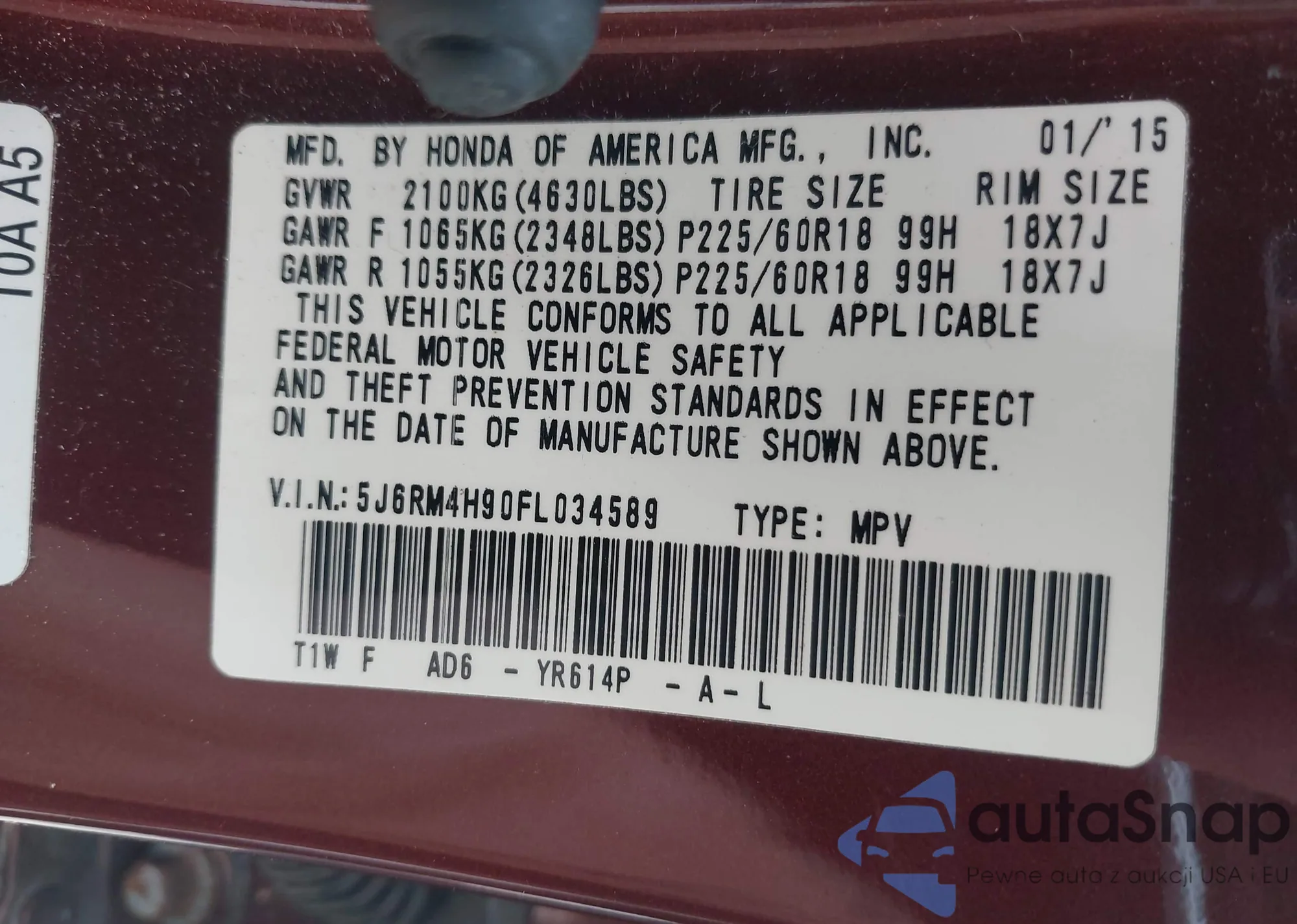 • VIN 5J6RM4H90FL034589